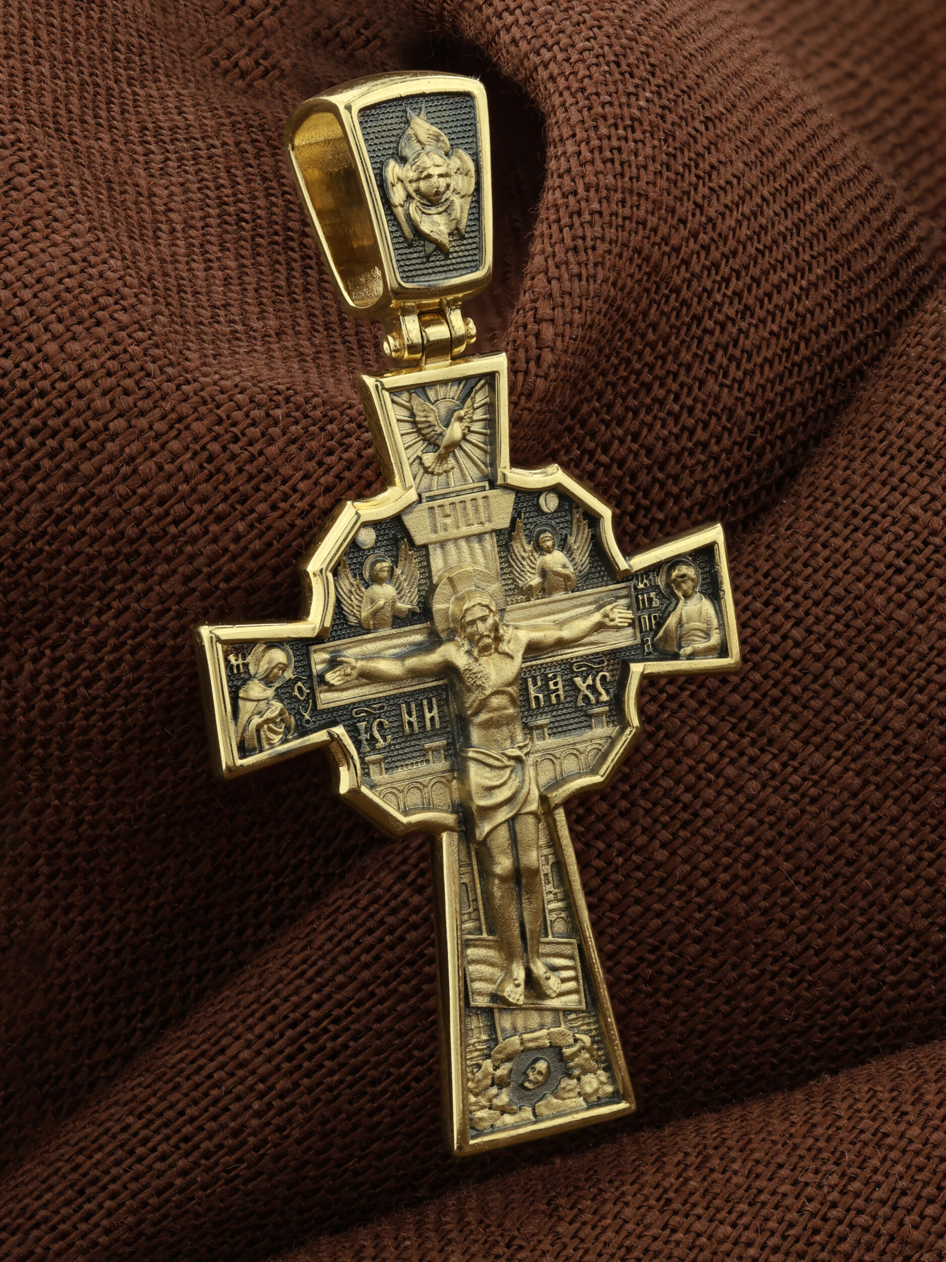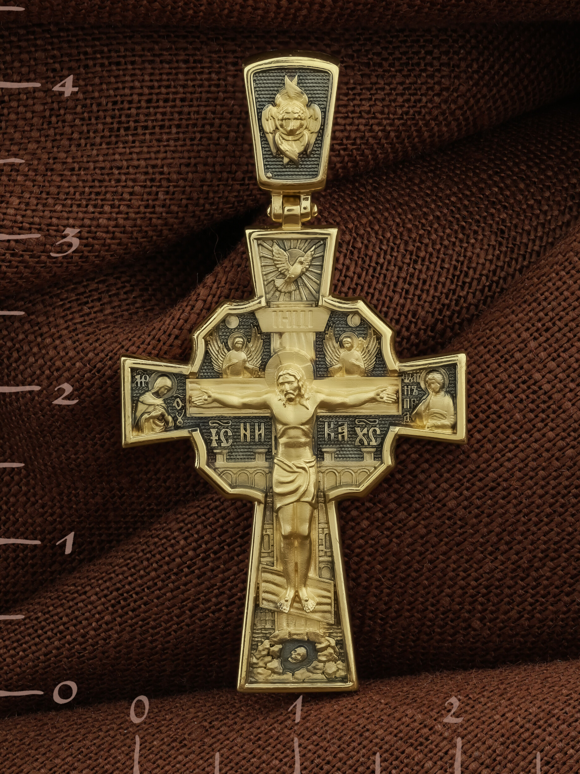 На лицевой стороне креста изображено Распятие Господа и Спасителя нашего Иисуса Христа, отдавшего Себя на смерть, для искупления грехов мира. Верхняя перекладина символизирует титло — табличку, на которой, согласно Евангелию, было начертано: Иисус Назорей Царь Иудейский (IНЦI). Распятие сопровождается надписями, олицетворяющими Христа. Надпись «IС» « ХС», что означает Иисус Христос, и слово «НИКА», что означает «победитель», помещаются ниже поперечной перекладины креста. Над вершиной Распятия помещено изображение Святого Духа, в виде голубя сходящего с небес, и двух Ангелов. Слева от Распятия изображена Пресвятая Богородица, справа — апостол и евангелист Иоанн Богослов, один из ближайших учеников Иисуса Христа. За крестом высится Иерусалимская стена, в знак того, что Господь был распят вне стен города. Возвышение, на котором стоит Крест, символизирует гору Голгофу, на которой произошло Распятие. Под подножием Креста изображена покоящаяся голова (череп) Адама. На кулонном кольце помещено изображение шестикрылого Серафим.