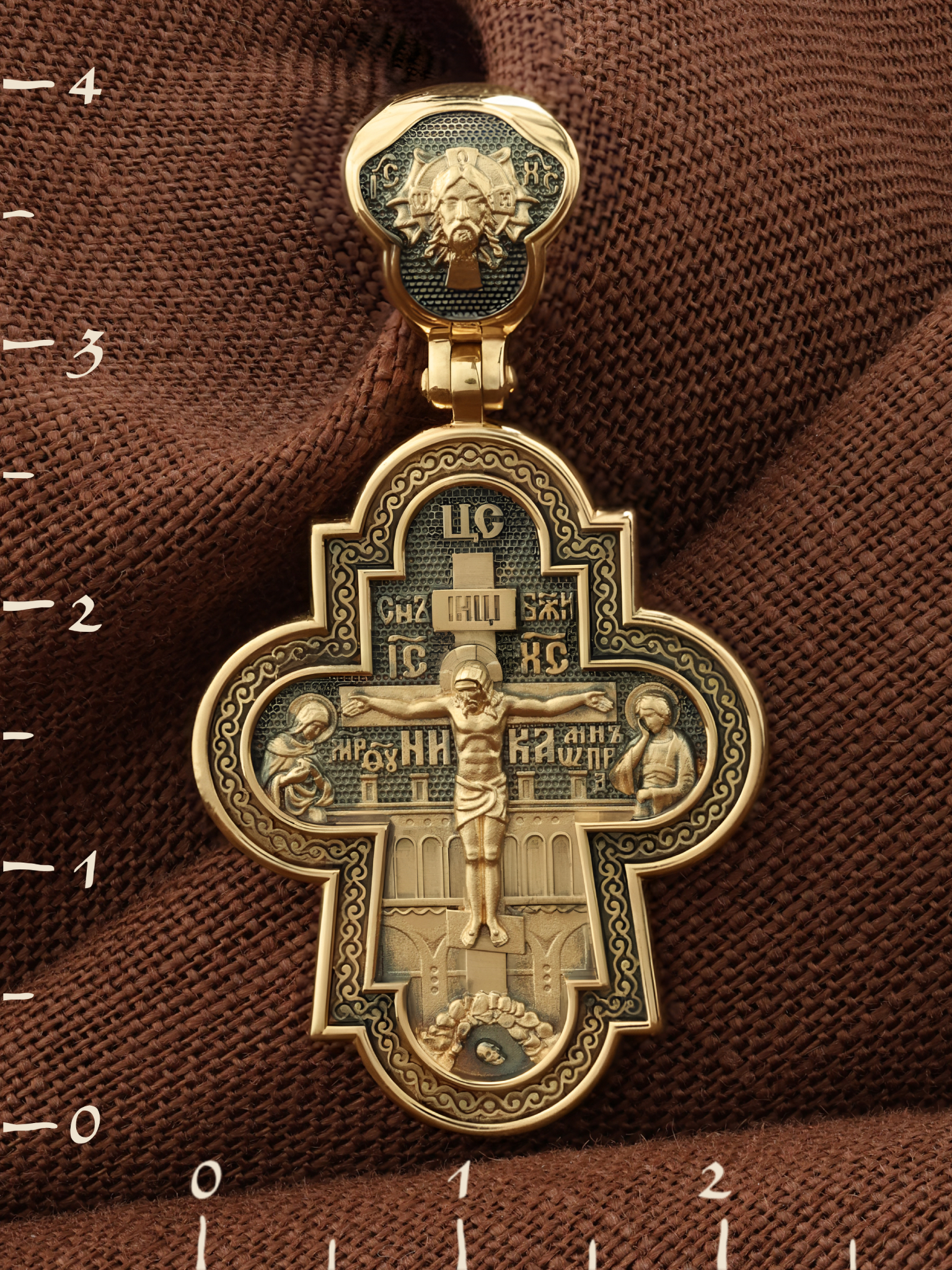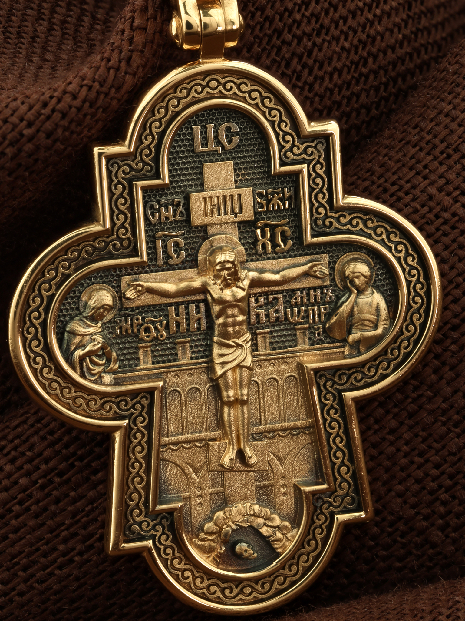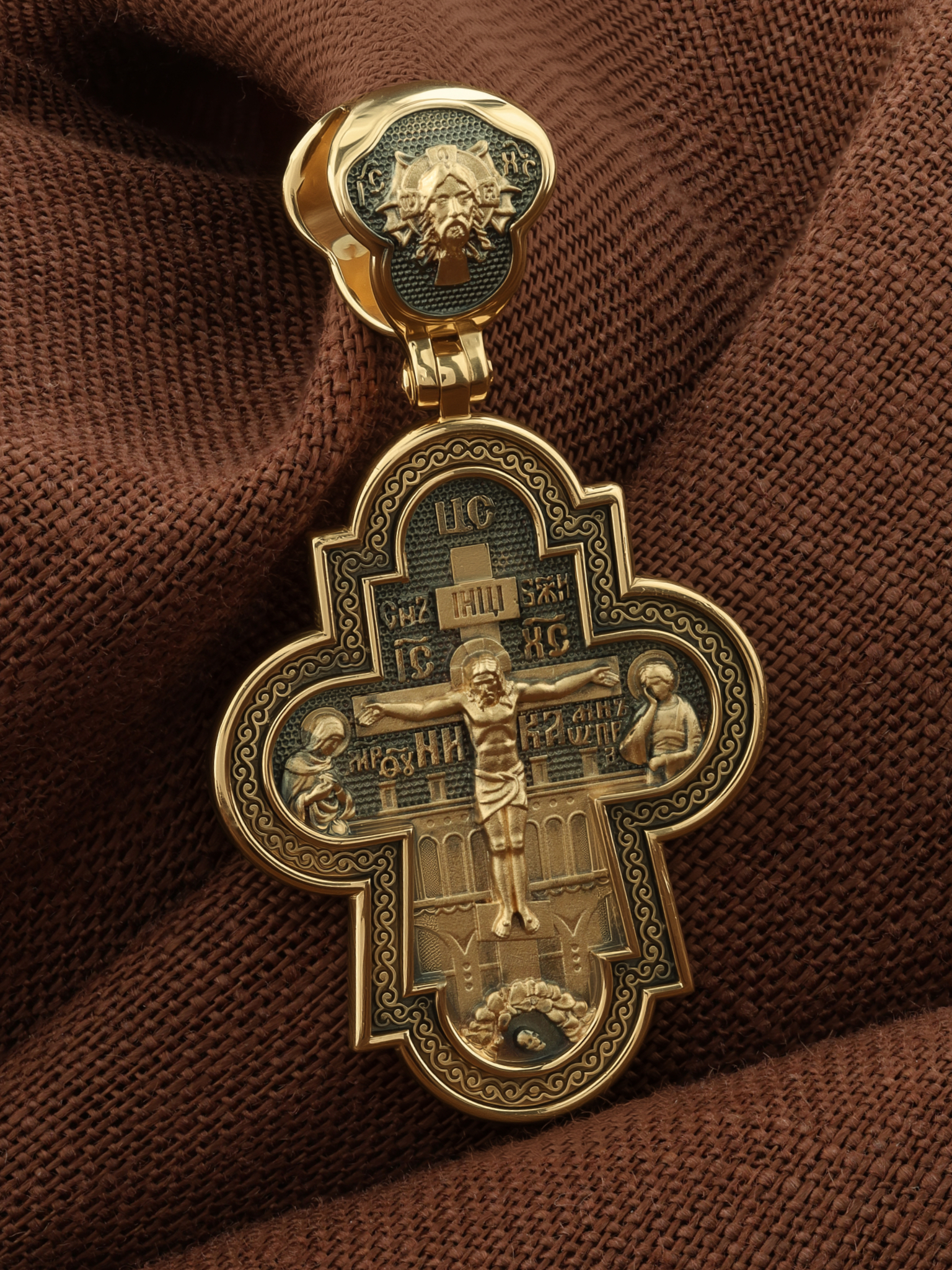 На лицевой стороне креста изображено Распятие Господа и Спасителя нашего Иисуса Христа, отдавшего Себя на смерть, для искупления грехов мира. Крест является символом жертвенной любви Всеблагого Бога к падшим людям, всепобеждающим духовным оружием христиан, основанием и средоточием церковной жизни. Господь сказал: кто хочет идти за Мною, отвергнись себя, и возьми крест свой, и следуй за Мною. (Мк. 8: 34). Над Распятием помещена надпись «Царь Славы». На верхней табличке, выше головы Иисуса, расположена надпись, составленная Понтием Пилатом — «IНЦI». Она означает «Иисус Назорей, Царь Иудейский». Надпись «IC» «ХC», означает Иисус Христос, помещается на разных сторонах поперечной перекладины креста. Возвышение, на котором стоит Крест, символизирует гору Голгофу, на которой произошло Распятие. Под подножием Креста изображена покоящаяся голова (череп) Адама. На кулонном кольце изображен Нерукотворный образ Господа и Спасителя нашего Иисуса Христа, чудесно отпечатавшийся на плате, которым Христос вытер свой лик.