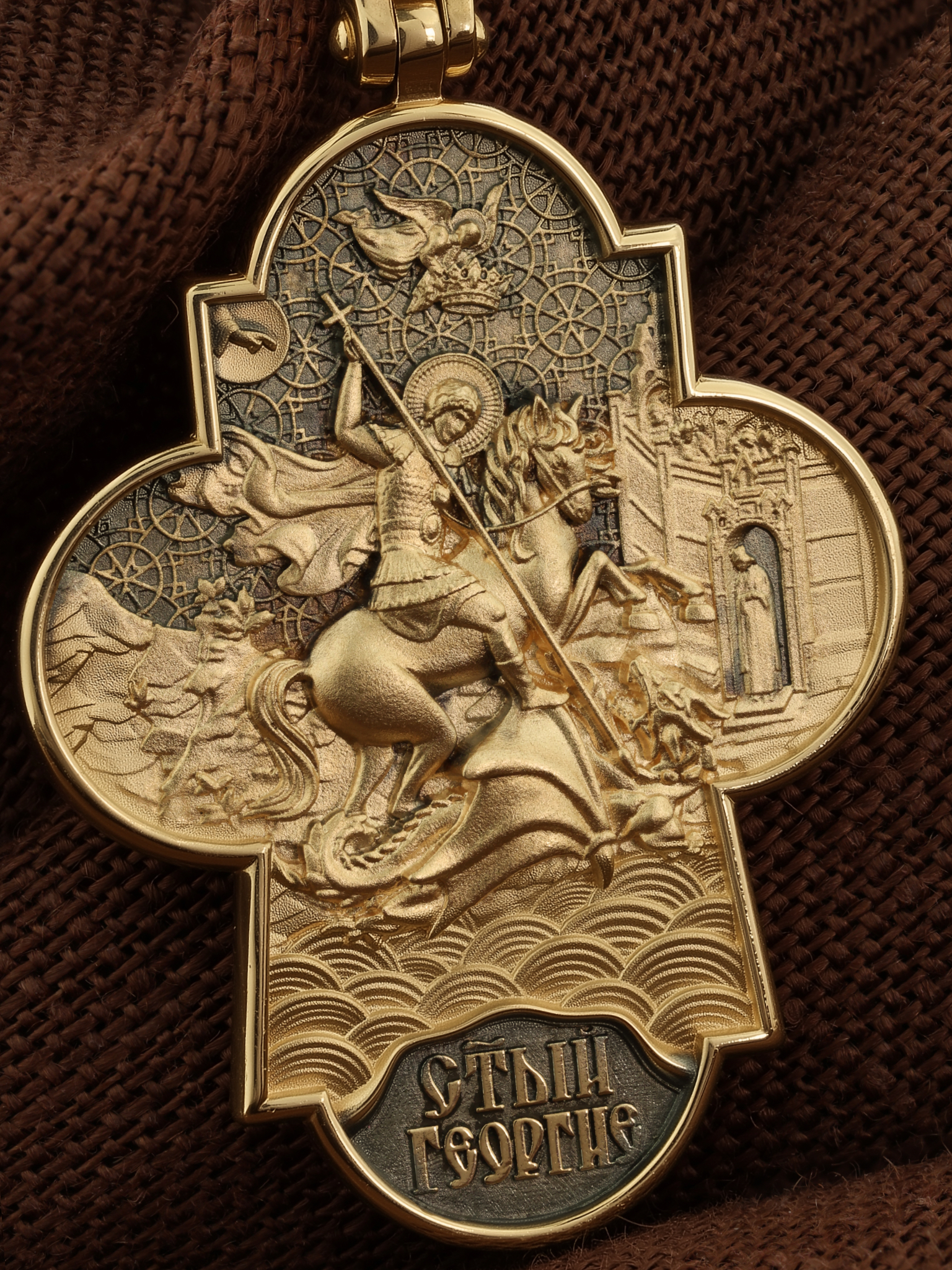 На оборотной стороне креста помещено изображение Святого Великомученика Георгия Победоносца — одного из самых почитаемых и удивительных святых. Георгий родился в Каппадокии (Малая Азия) в семье богатых и знатных горожан. Юношей поступил на службу к римскому императору Диоклетиану, за отличное знание военного дела и проявленную в боях и походах храбрость был приближен к императору и удостоен высокого воинского звания. Во время начавшихся гонений на христиан, перешел на сторону гонимых и, отвергнув человеческий страх, стал ярым проповедником учения Христа. Мучители подвергли опального воеводу жесточайшим восьмидневным пыткам и казнили его (обезглавили) в возрасте около тридцати лет в 303 году. Георгий изображен как воитель, сидящий на вздыбленном коне и поражающий копьем огнедышащего змея. Слева над образом изображена благословляющая Божия десница. Над святым изображен ангел возлагающий на него венец мученика. Змей символизирует собою сатанинские силы. Молитвами вознесенными к Всевышнему и своей непреклонной верой он смог одолеть чудовище. Святой убил змея, спас царскую дочь, принесенную в жертву, и жителей города, их души от влияния дьявола, породив в них надежду и веру в Господа, призывая людей принять христианскую веру. На кулонном кольце изображен шестикрылый Ангел — Серафим.
