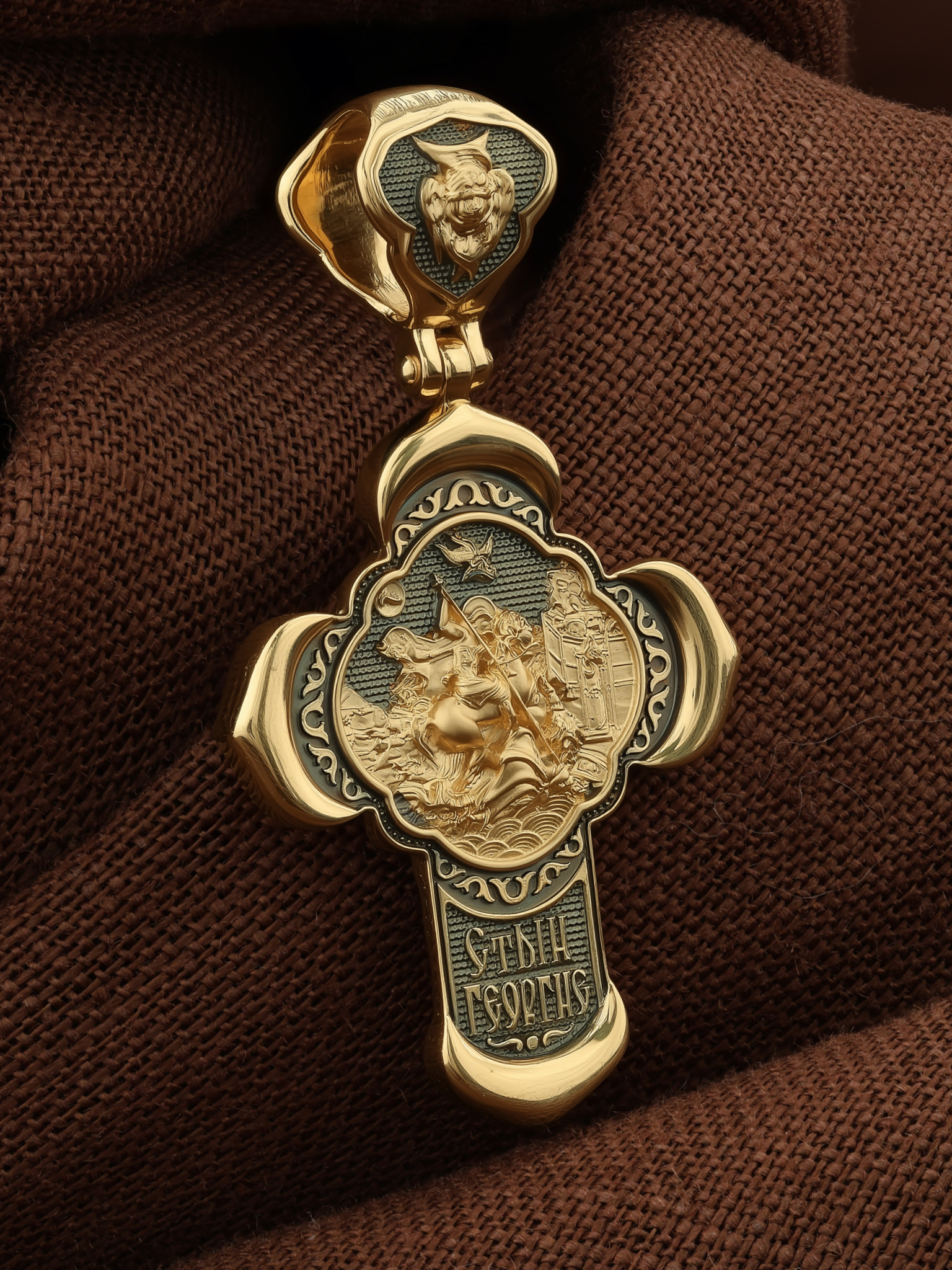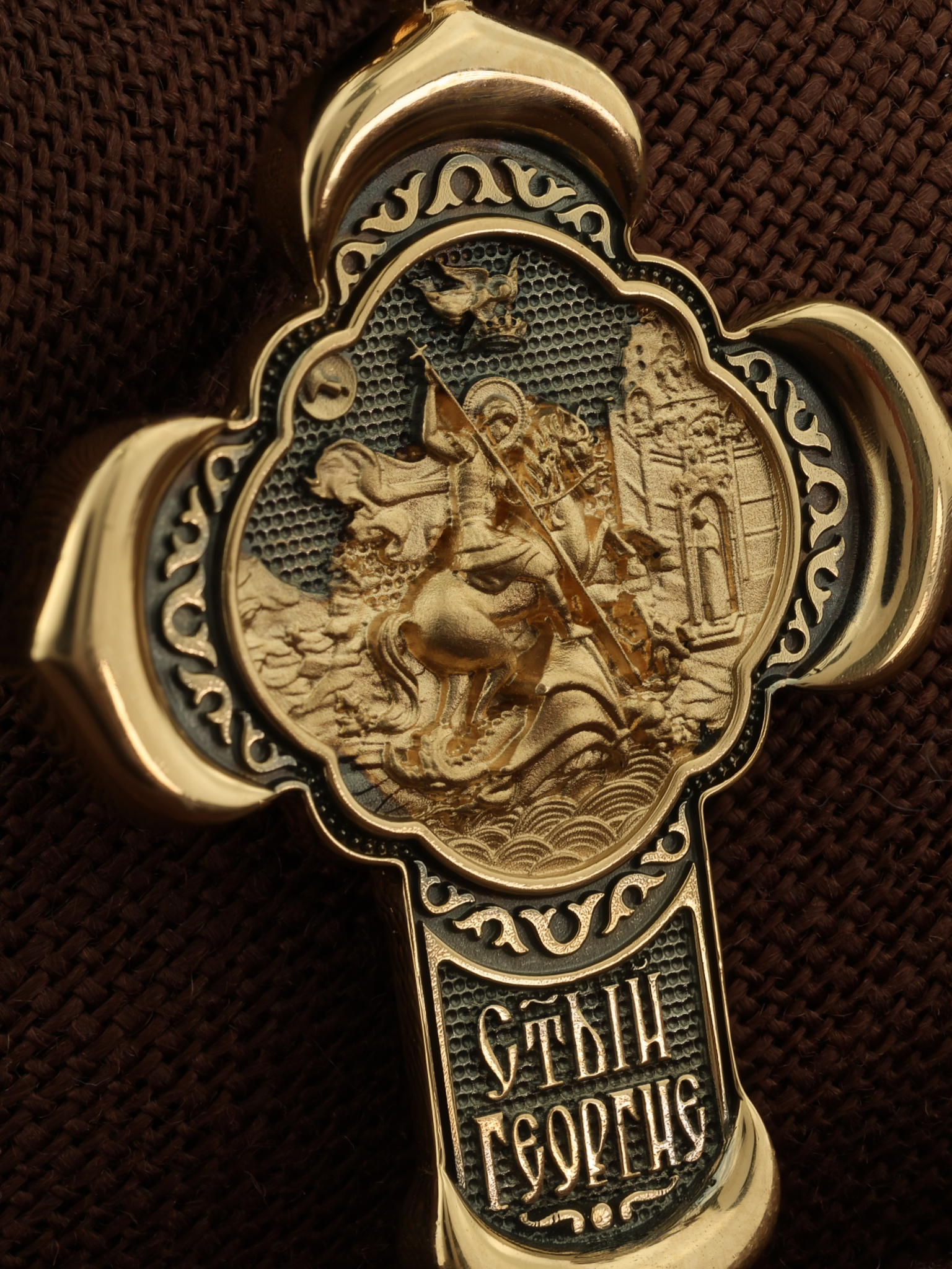На оборотной стороне креста помещено изображение Святого Великомученика Георгия Победоносца — одного из самых почитаемых и удивительных святых. Георгий родился в Каппадокии (Малая Азия) в семье богатых и знатных горожан. Юношей поступил на службу к римскому императору Диоклетиану, за отличное знание военного дела и проявленную в боях и походах храбрость был приближен к императору и удостоен высокого воинского звания. Во время начавшихся гонений на христиан, перешел на сторону гонимых и, отвергнув человеческий страх, стал ярым проповедником учения Христа. Мучители подвергли опального воеводу жесточайшим восьмидневным пыткам и казнили его (обезглавили) в возрасте около тридцати лет в 303 году. Георгий изображен как воитель, сидящий на вздыбленном коне и поражающий копьем огнедышащего змея. Слева над образом изображена благословляющая Божия десница. Над святым изображен ангел возлагающий на него венец мученика. Змей символизирует собою сатанинские силы. Молитвами вознесенными к Всевышнему и своей непреклонной верой он смог одолеть чудовище. Святой убил змея, спас царскую дочь, принесенную в жертву, и жителей города, их души от влияния дьявола, породив в них надежду и веру в Господа, призывая людей принять христианскую веру. На кулонном кольце изображен шестикрылый Ангел — Серафим.
