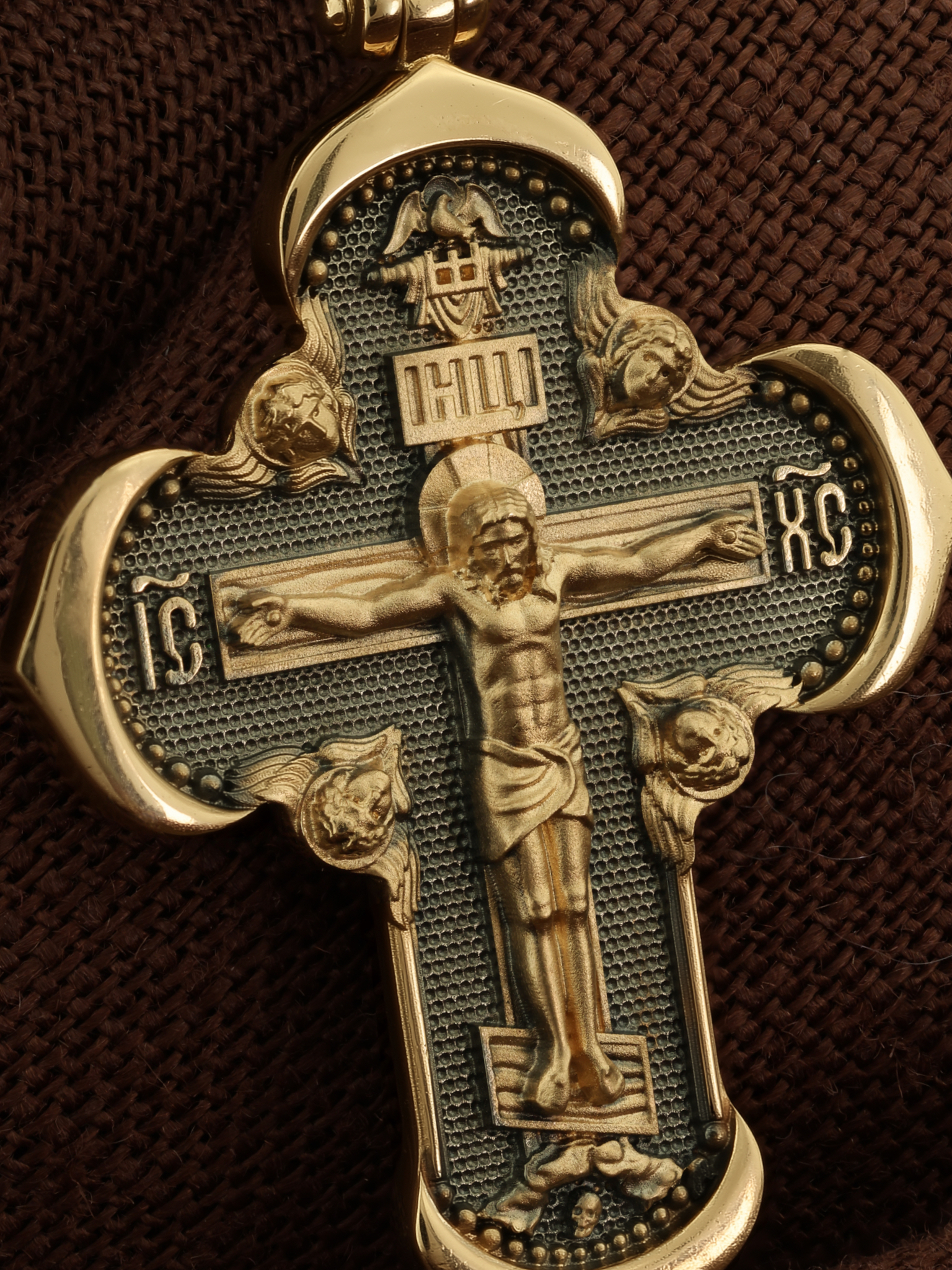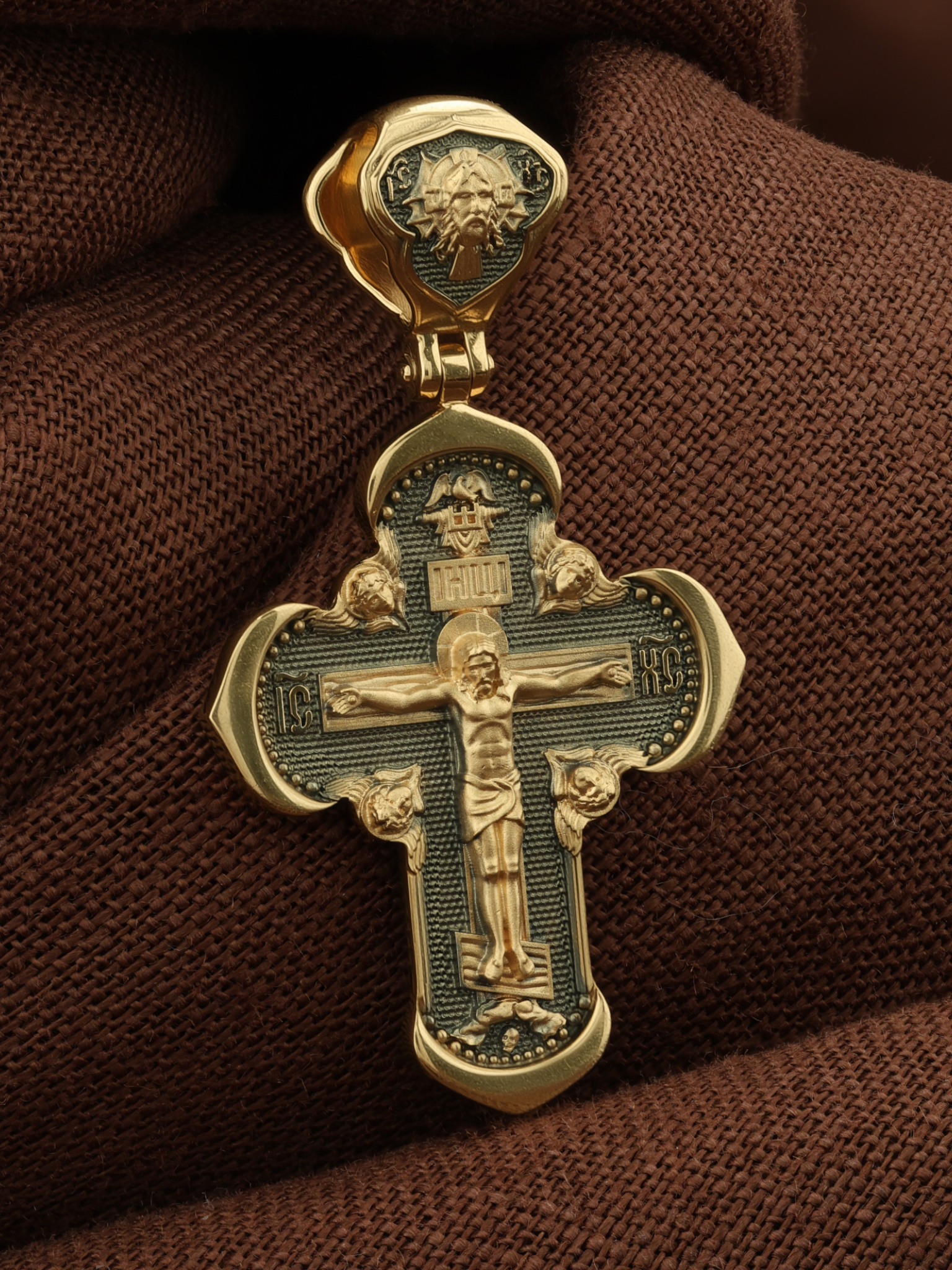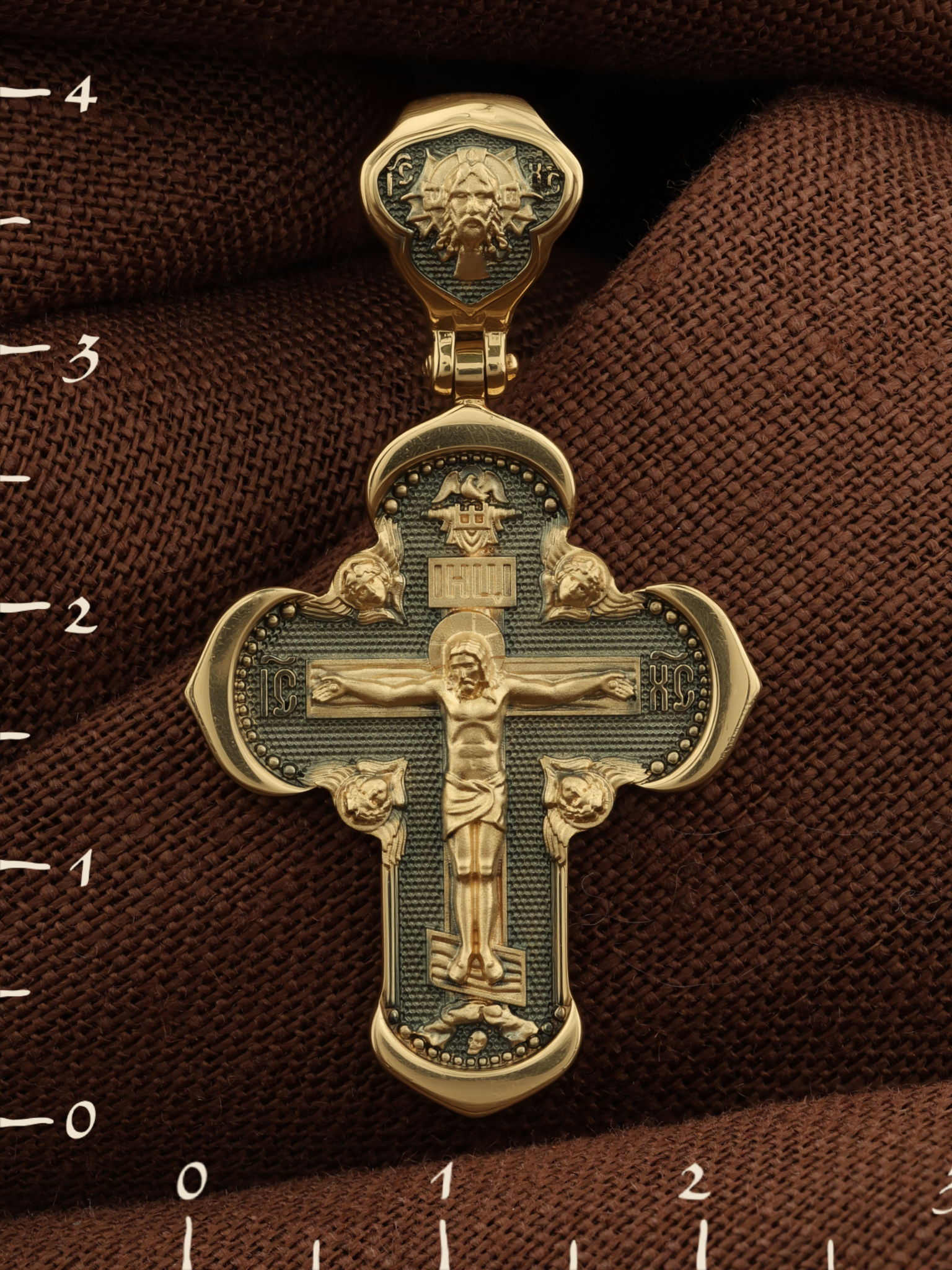 На лицевой стороне креста изображено Распятие Господа и Спасителя нашего Иисуса Христа, отдавшего Себя на смерть, для искупления грехов мира. Крест является символом жертвенной любви Всеблагого Бога к падшим людям, всепобеждающим духовным оружием христиан, основанием и средоточием церковной жизни. Господь сказал: кто хочет идти за Мною, отвергнись себя, и возьми крест свой, и следуй за Мною. (Мк. 8: 34). Над Распятием помещена надпись «Царь Славы». На верхней табличке, выше головы Иисуса, расположена надпись, составленная Понтием Пилатом — «IНЦI». Она означает «Иисус Назорей, Царь Иудейский». Надпись «IC» «ХC», означает Иисус Христос, помещается на разных сторонах поперечной перекладины креста. Возвышение, на котором стоит Крест, символизирует гору Голгофу, на которой произошло Распятие. Под подножием Креста изображена покоящаяся голова (череп) Адама. На кулонном кольце изображен Нерукотворный образ Господа и Спасителя нашего Иисуса Христа, чудесно отпечатавшийся на плате, которым Христос вытер свой лик.