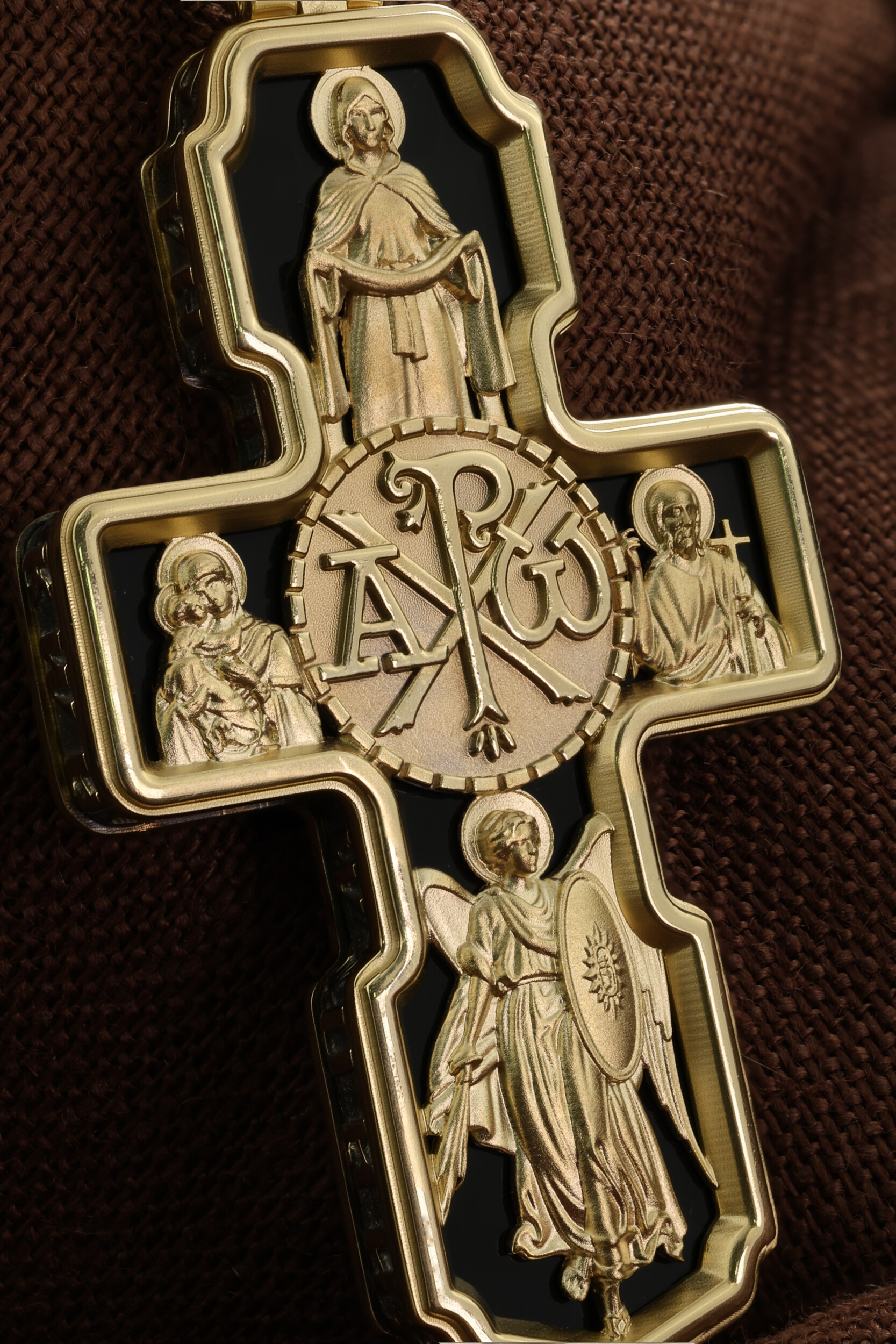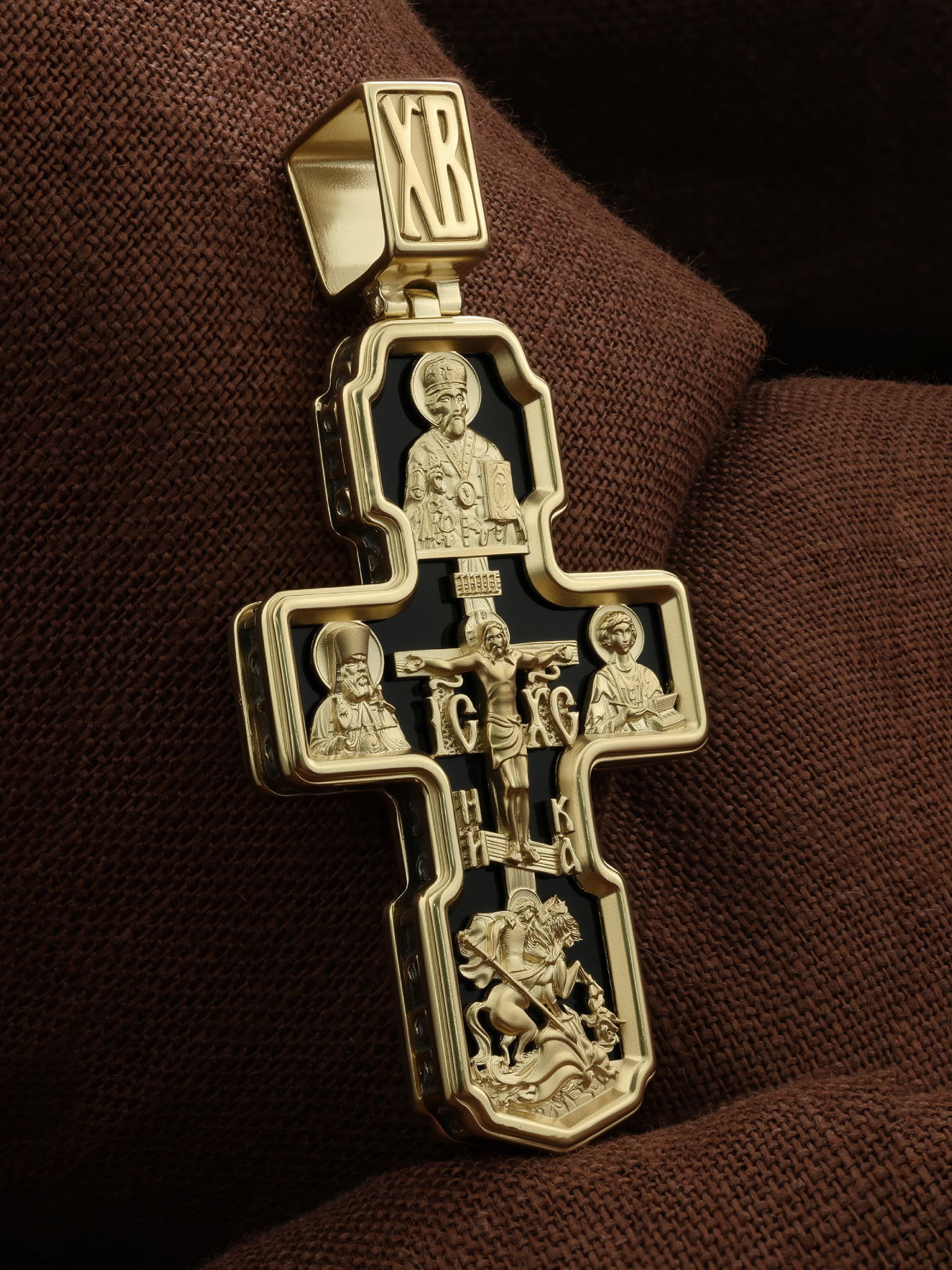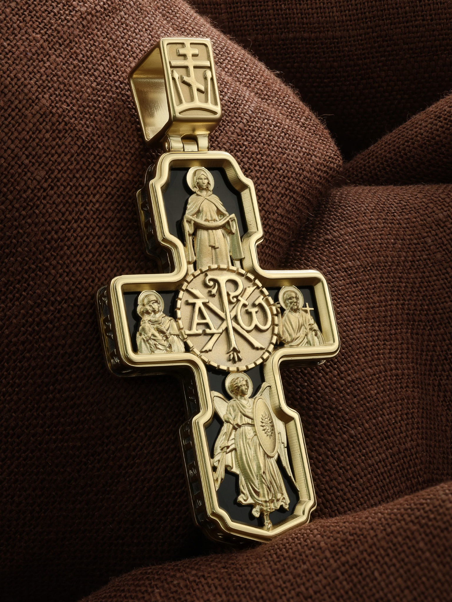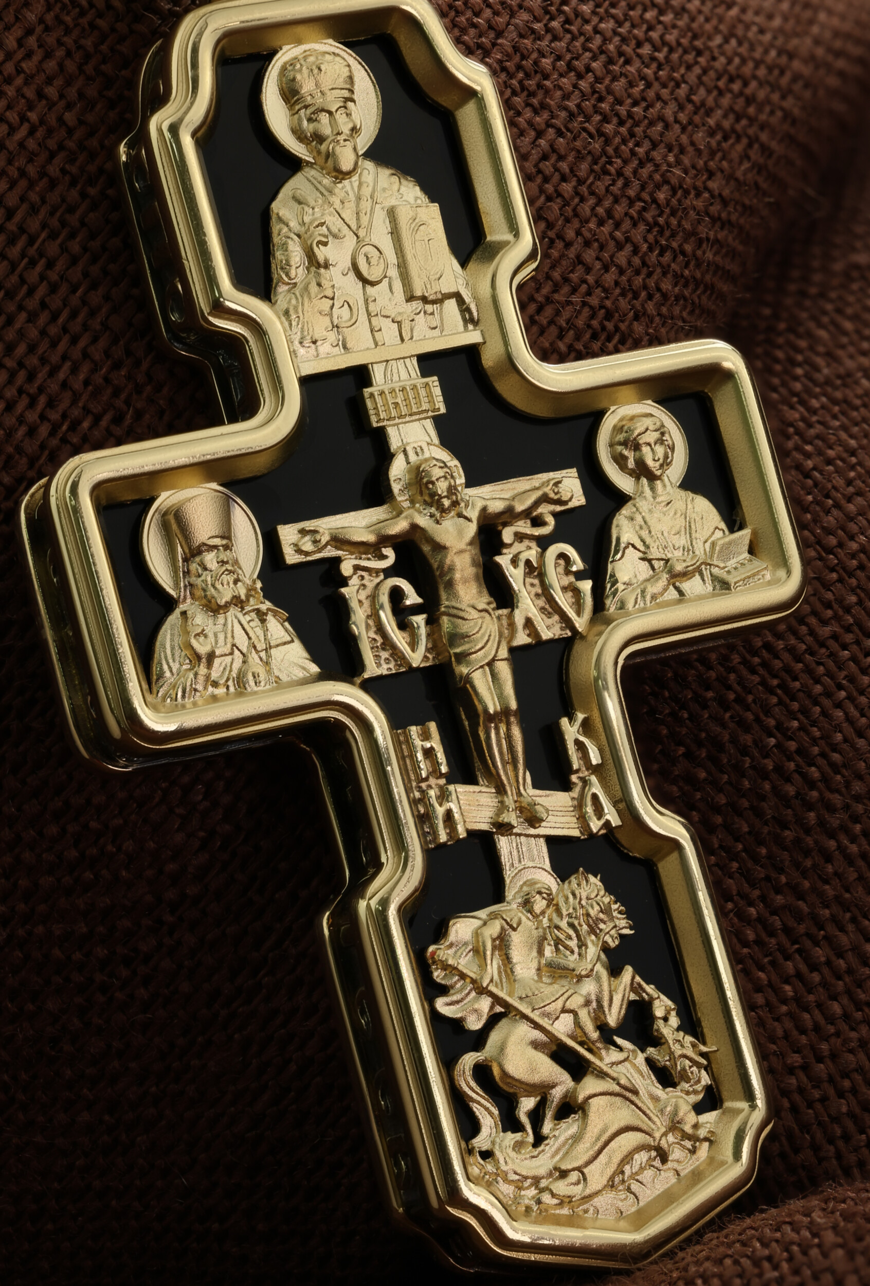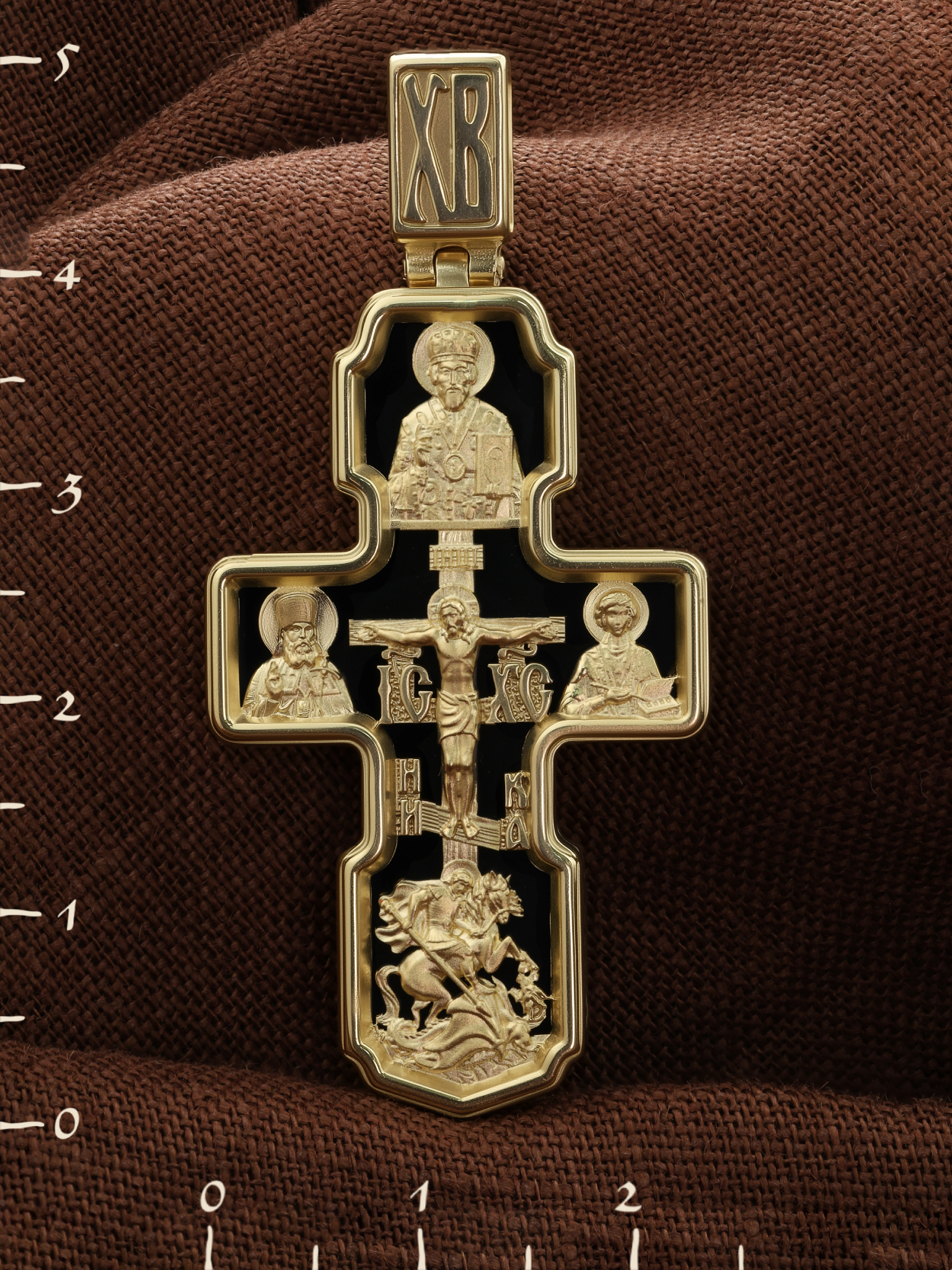 На лицевой стороне креста изображено Распятие Господа и Спасителя нашего Иисуса Христа. Христос, подвергнутый на кресте мучительной казни, своими страданиями искупил нас от древнего греха и даровал нам жизнь вечную. Без Распятия не было бы Воскресения Христова, и поэтому Крест из орудия казни обратился в святыню, в которой действует Благодать Божия. На верхней табличке, выше головы Иисуса, расположена надпись, составленная Понтием Пилатом на трех языках — «IНЦI». Она означает «Иисус Назорей, Царь Иудейский». Надпись «IС ХС» означает Иисус Христос и помещается на разных сторонах поперечной (большой) перекладины креста. На нижней перекладине находится надпись –«НИКА», что означает победитель. Над Распятием размещен образ Святителя Николая Чудотвореца, архиепископа Мир Ликийских. Ниже Распятия — образ Святого Великомученика Георгия Победоносца. Он изображен как воитель, сидящий на вздыбленном коне и поражающий копьем огнедышащего змея. Слева — образ Святителя Луки (Войно-Ясенецкого), а справа — образ Святого великомученика и целителя Пантелеимона. На кулонном кольце находится надпись «ХВ», что означает Христос Воскрес.