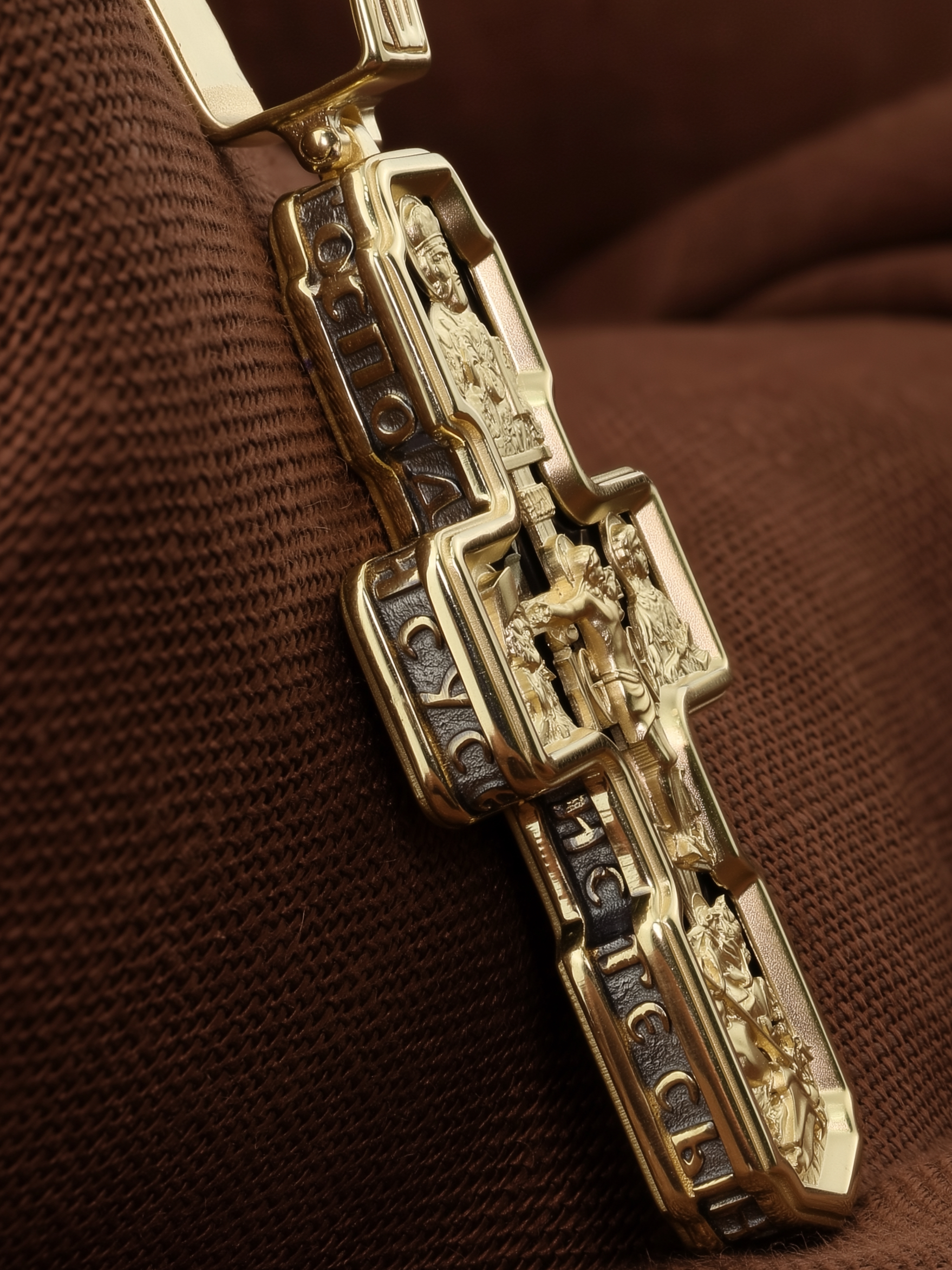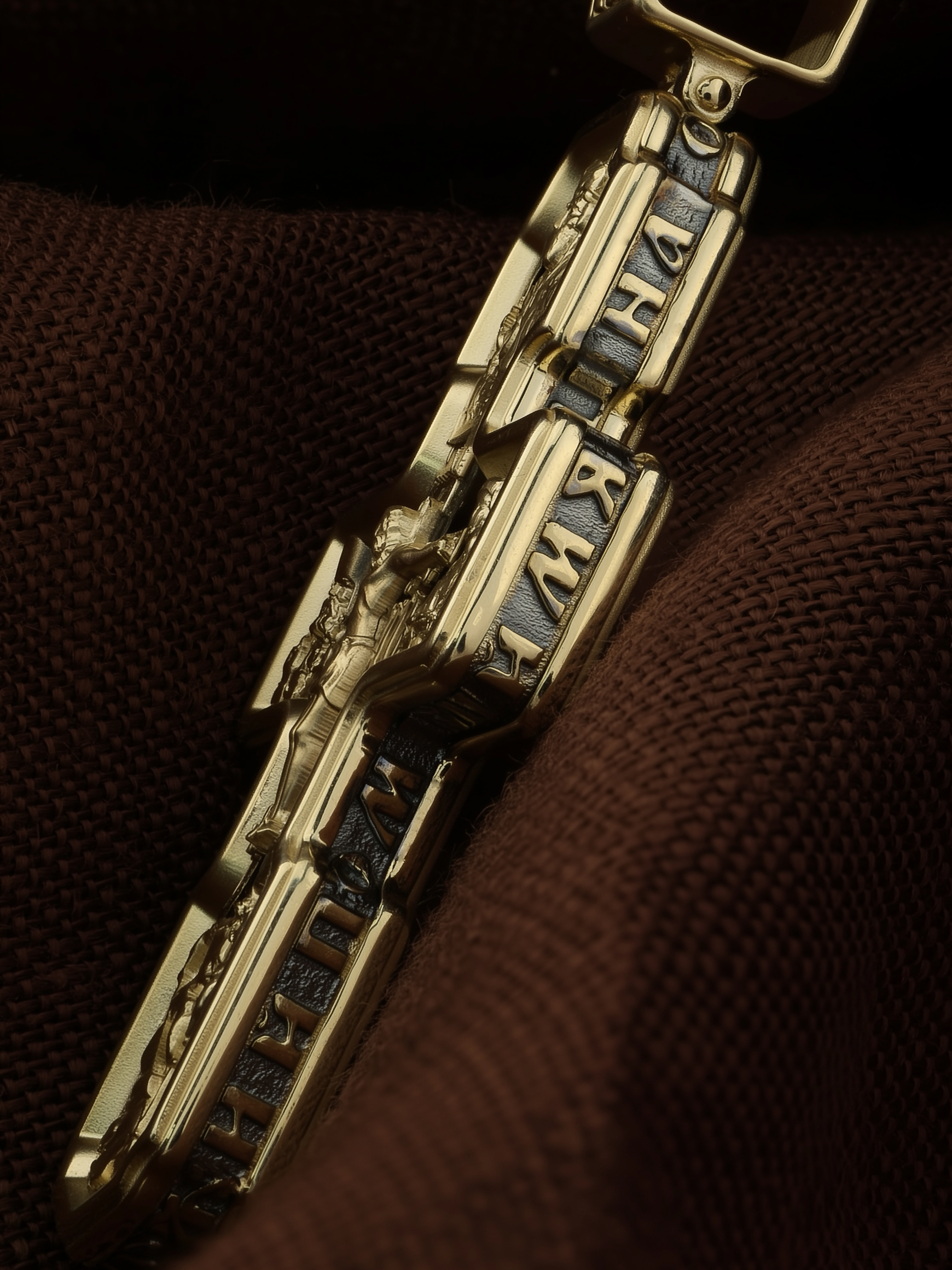 На торцевой стороне креста размещены слова Иисусовой молитвы: «Господи Иисусе Христе, Сыне Божий, помилуй мя, грешного».