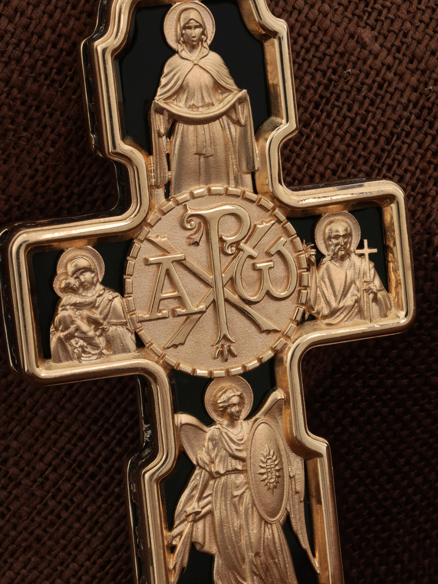 На торцевой стороне креста размещены слова Иисусовой молитвы: «Господи Иисусе Христе, Сыне Божий, помилуй мя, грешного».
