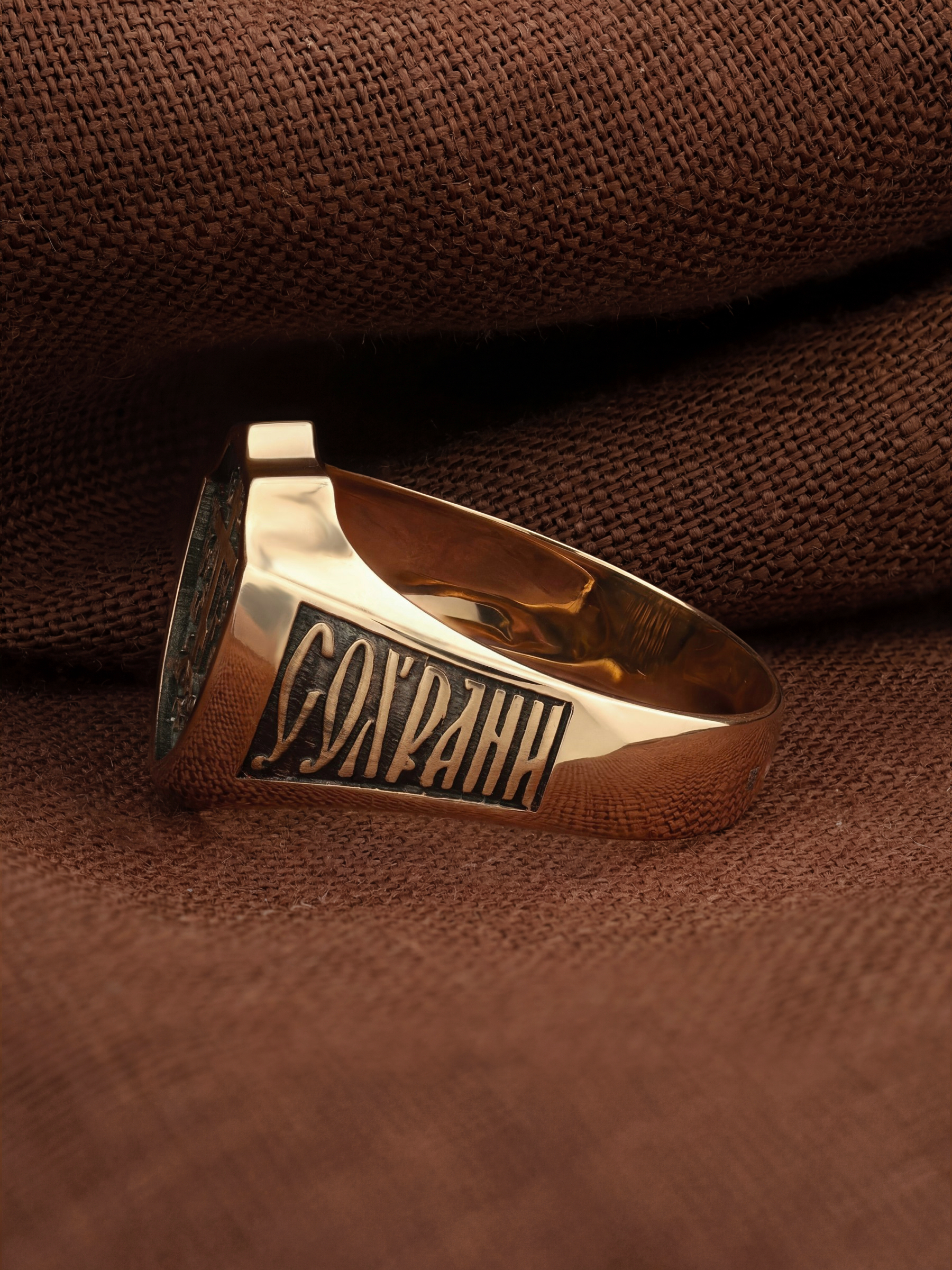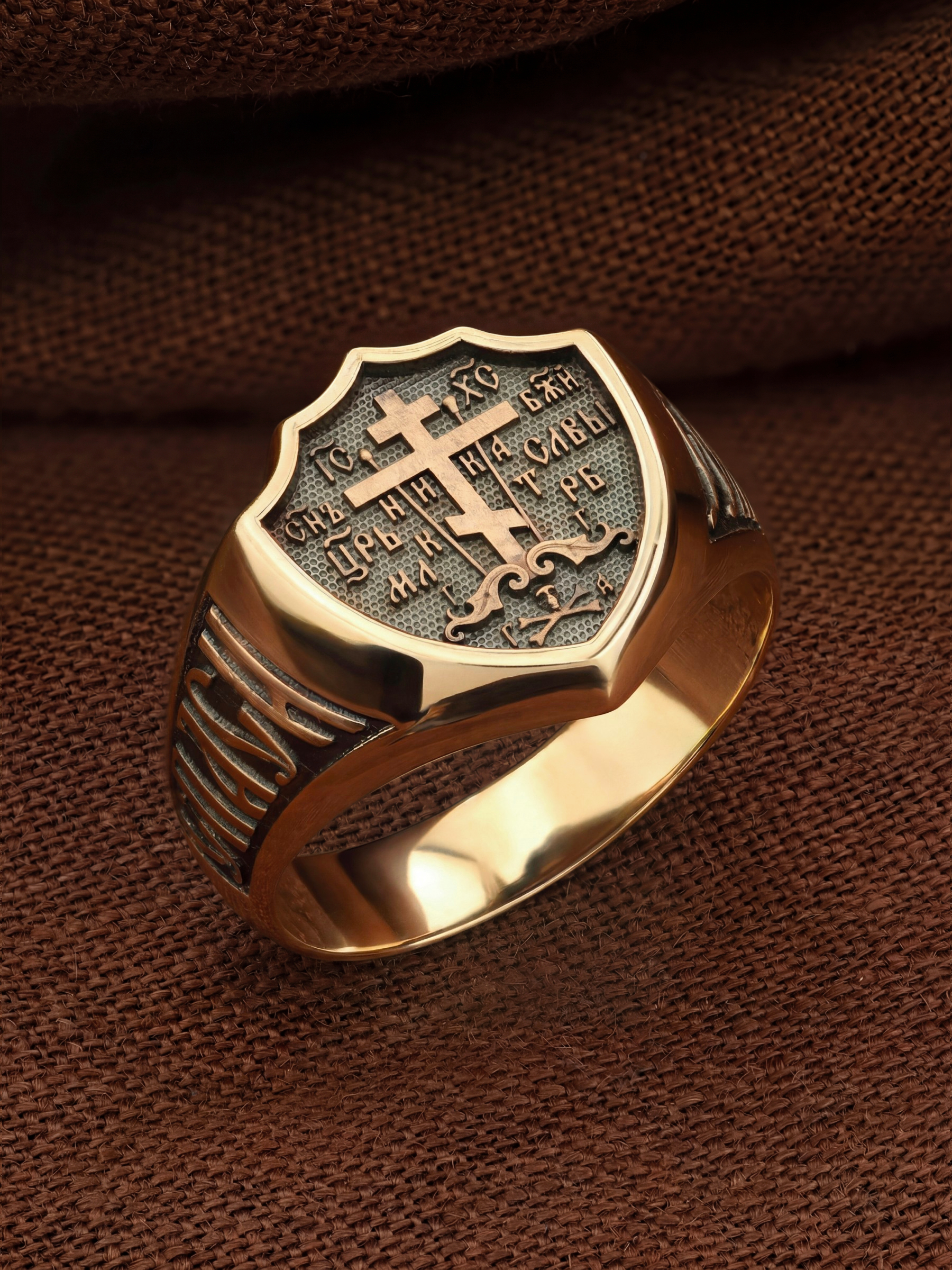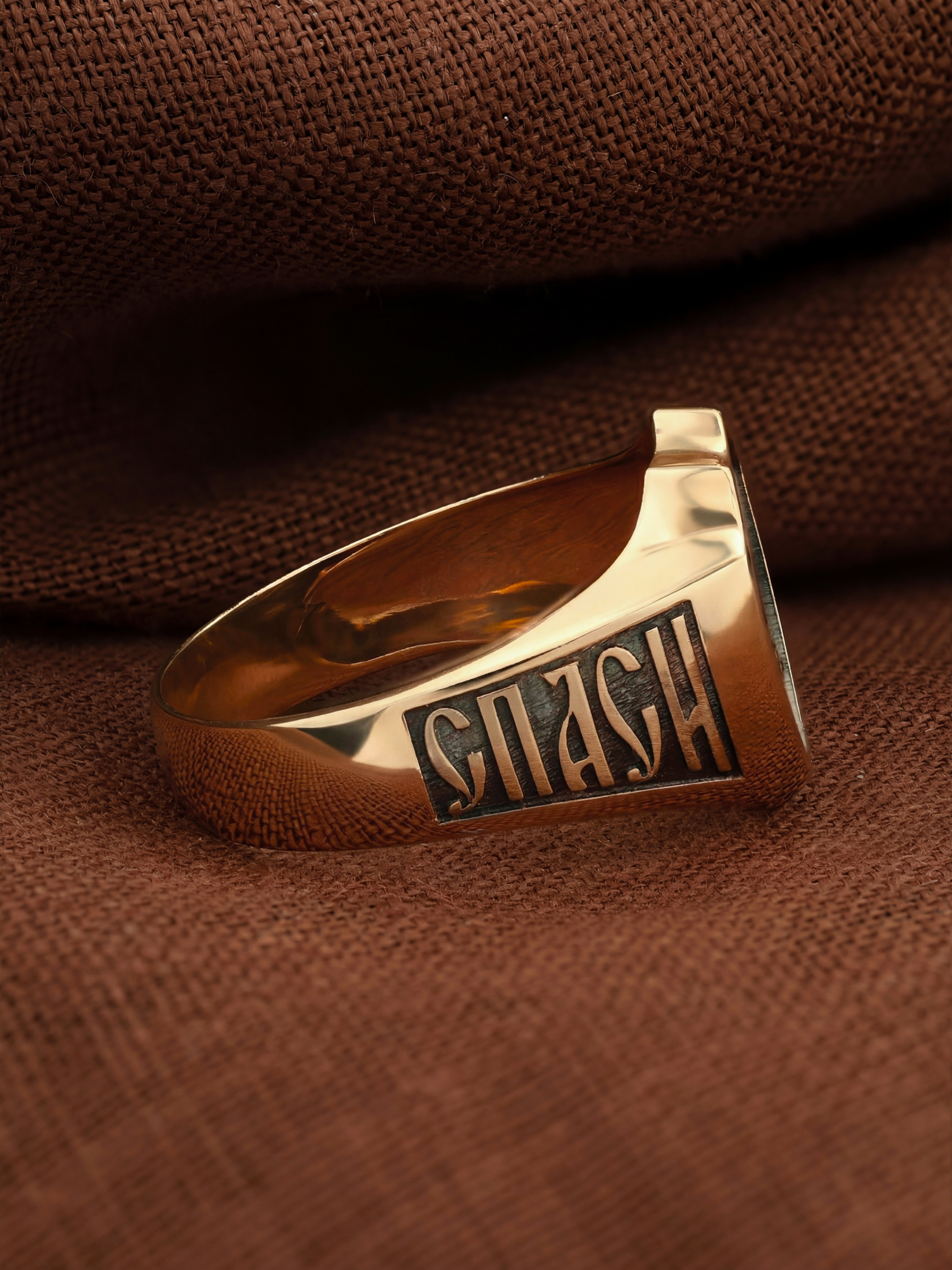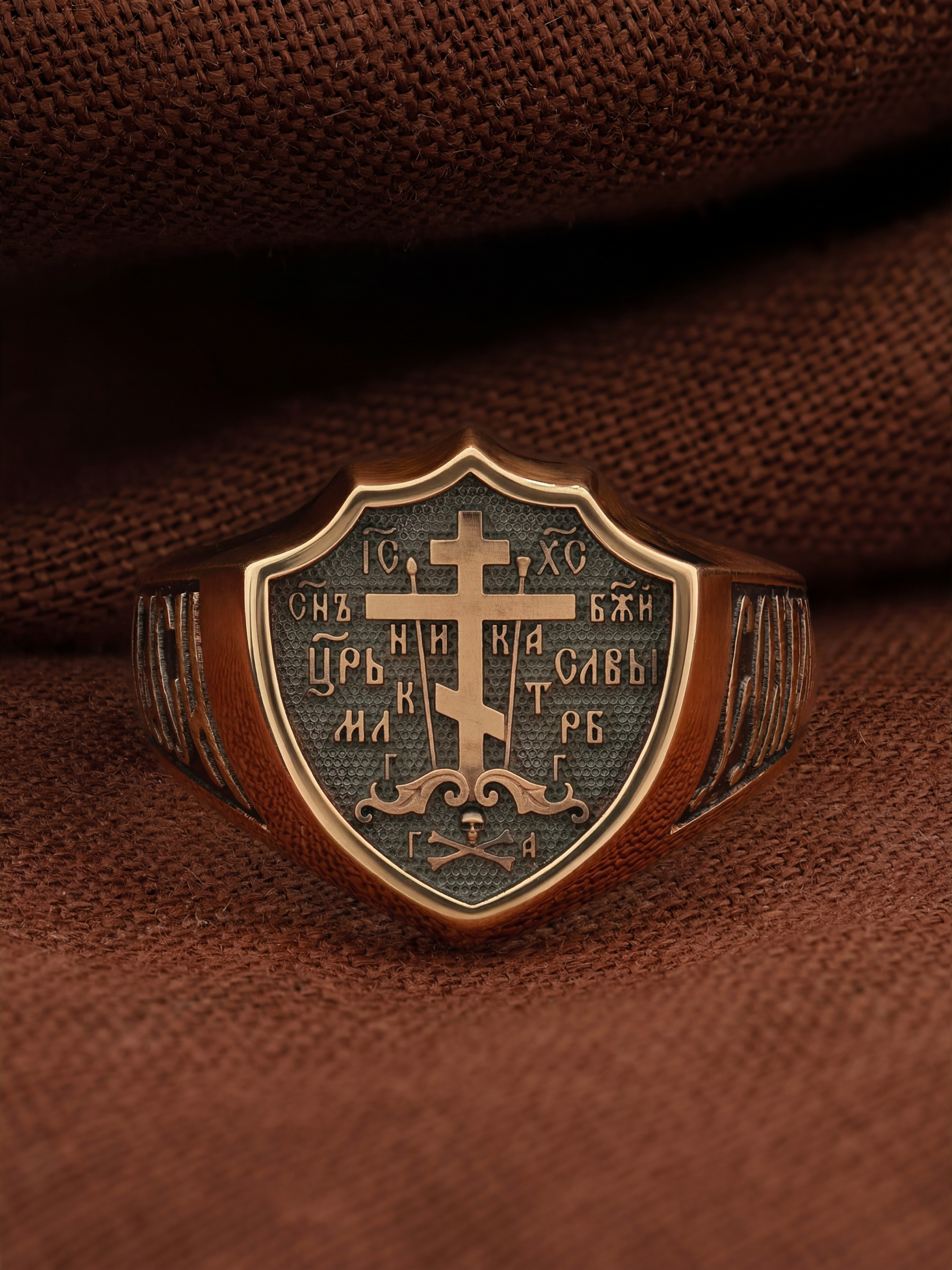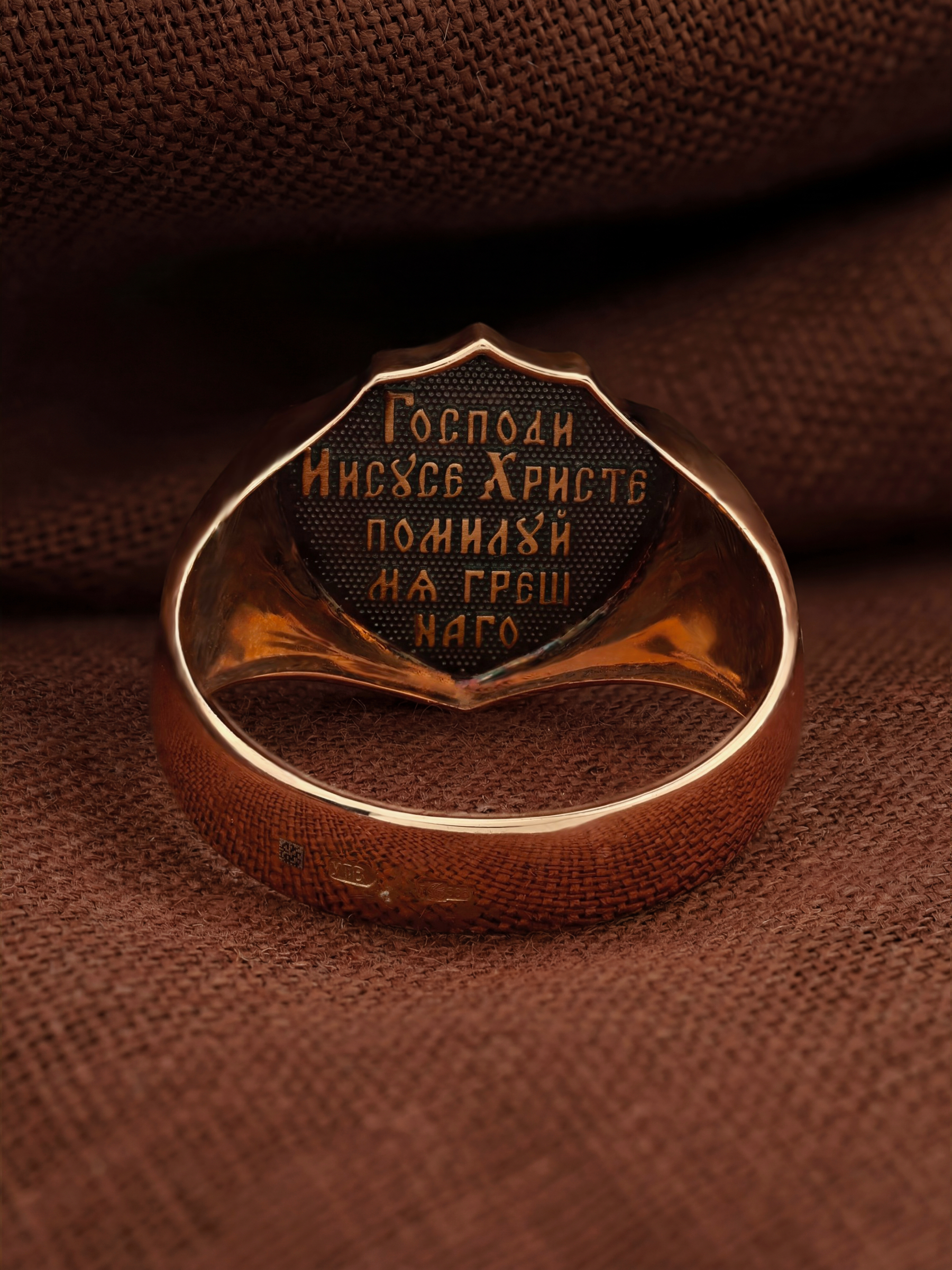 На перстне изображен «Голгофский крест». Центральным и главным элементом композиции лицевой стороны является восьмиконечный крест — образ Честного и Животворящего Креста Господня, установленного на горе Голгофе. В основании креста изображена гора Голгофа, на которой был распят Спаситель и череп Адама, чьи кости по приданию омыла кровь Иисуса Христа. Перед головой располагаются лежащие кости рук, изображаются правая на левой, как при погребении или причащении. В XVI веке на Руси около изображения Голгофы появились обозначения «М.Л.Р.Б.» — Место Лобное Рай Бысть (Голгофа в переводе с еврейского — Лобное место). Чуть ниже справа и слева буквы «Г.Г.» — гора Голгофа.