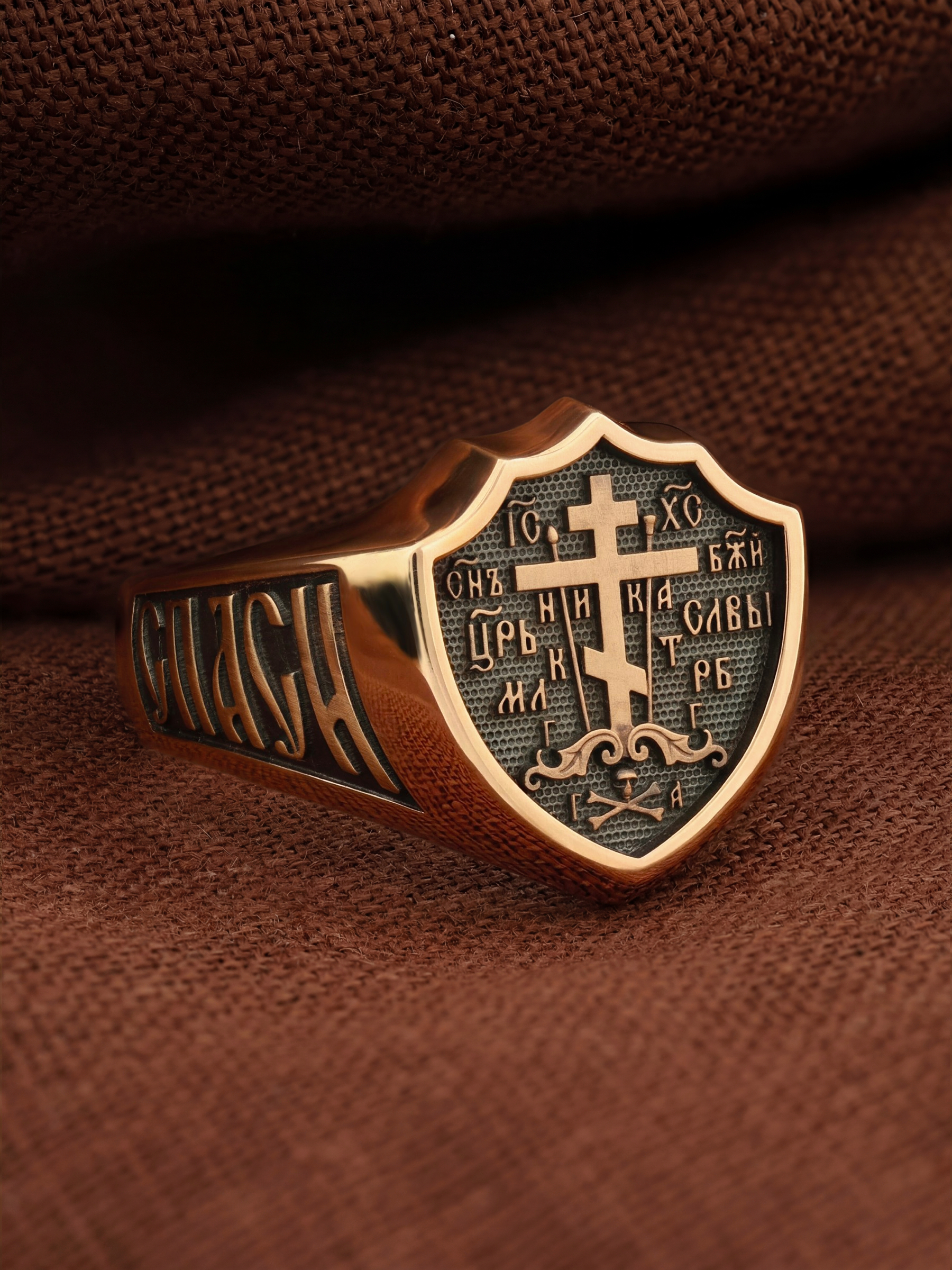 Вдоль креста располагаются буквы «К» и «Т» — означают копье и трость с губкой, пропитанной уксусом, которую подали жаждущему Иисусу Христу. Над средней перекладиной видны слова «ЦРЬ СЛВЫ», что означает Царь Славы. Под ней помещено слово «Ника» — что означает Победитель. Над средней перекладиной видна надпись «СНЪ БЖIЙ», что означает Сын Божий. А над верхней перекладиной надписи «IC» «ХС» — имя Иисуса Христа.