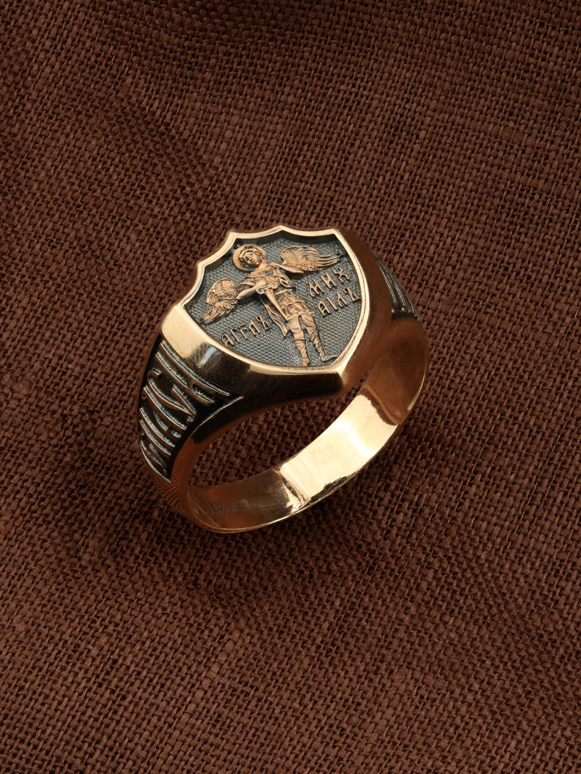 Кольцо «Архангел Михаил» выполнено в древних христианских традициях. Архангел Михаил — верный служитель Божий, который низринул с Неба возгордившегося денницу с другими павшими духами. В Православии его называют Архистратигом, что означает глава святого воинства Ангелов и Архангелов. Архангел Михаил изображен в воинственном виде с огненным мечом в правой руке и щитом в левой. Архангел почитается как покровитель воинов и всех верных Богу и ведущих борьбу против сил зла, борец против ересей, а также защитник душ умерших, страж райских врат. С древних времен прославлен своими чудесами Архангел Михаил на Руси. Примеров явления и помощи Архистратига Михаила в русской истории бессчетно. Архангел Михаил не перестает ратоборствовать за славу Творца и Господа всяческих, за дело спасения рода человеческого, за церковь и чад ее. И, согласно, Откровению Иоанна Богослова во время последней битвы небесных и дьявольских сил Михаил и его ангелы опять низвергнут Люцифера вместе с его войском: «Михаил и Ангелы его воевали против дракона, и дракон и ангелы его воевали [против них], но не устояли, и не нашлось уже для них места на небе. И низвержен был великий дракон, древний змий, называемый диаволом и сатаною, обольщающий всю вселенную, низвержен на землю, и ангелы его низвержены с ним» (Откр.12:7−9).