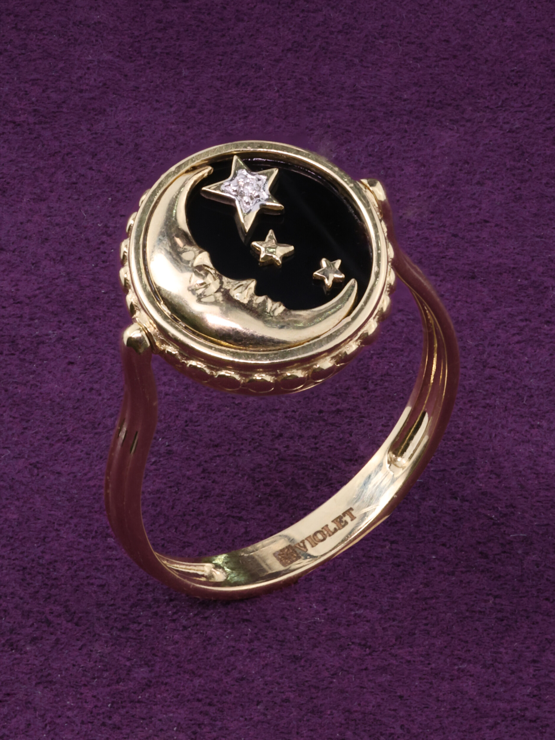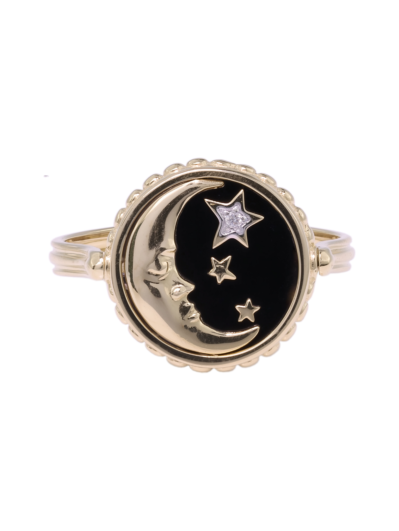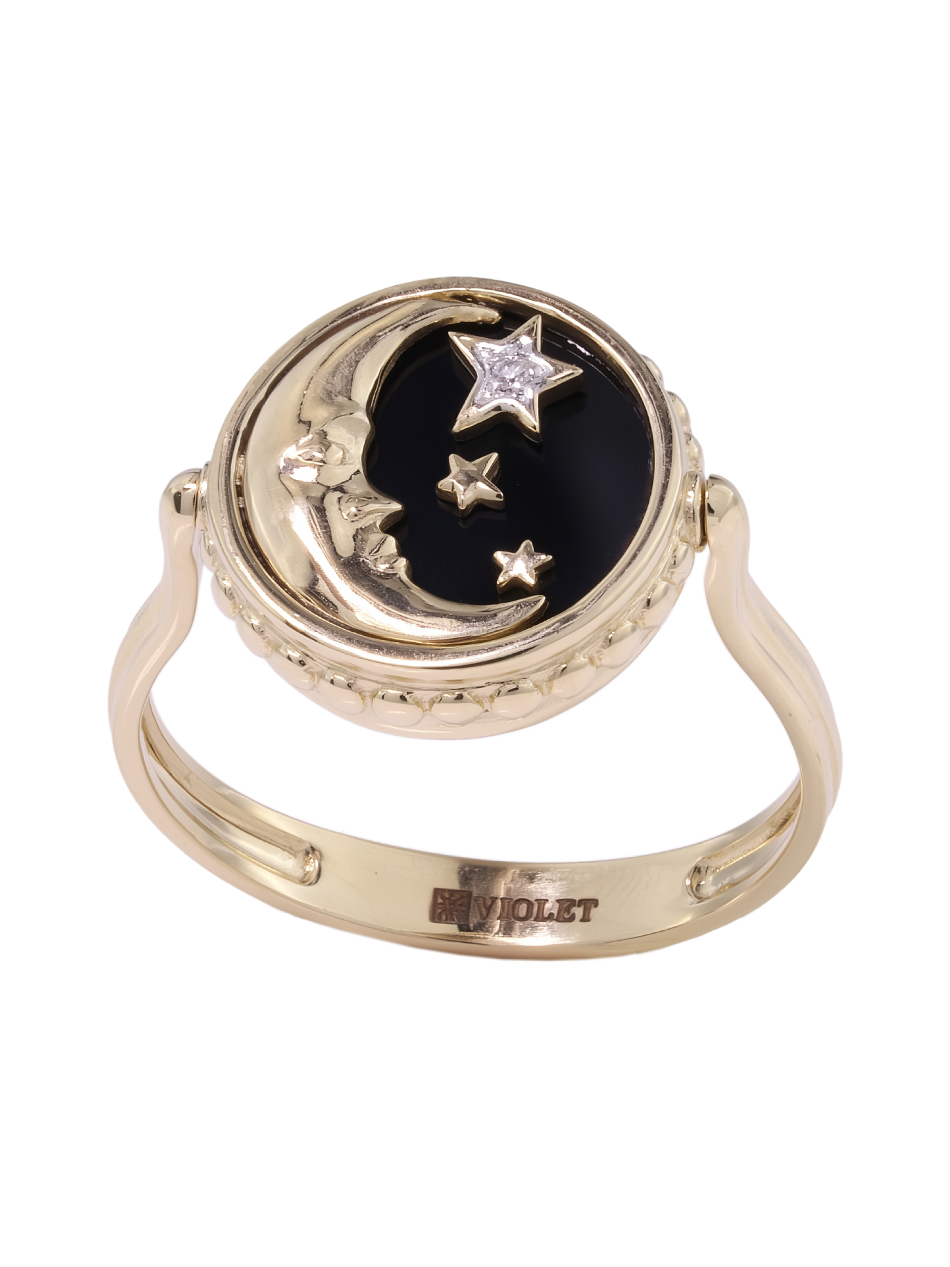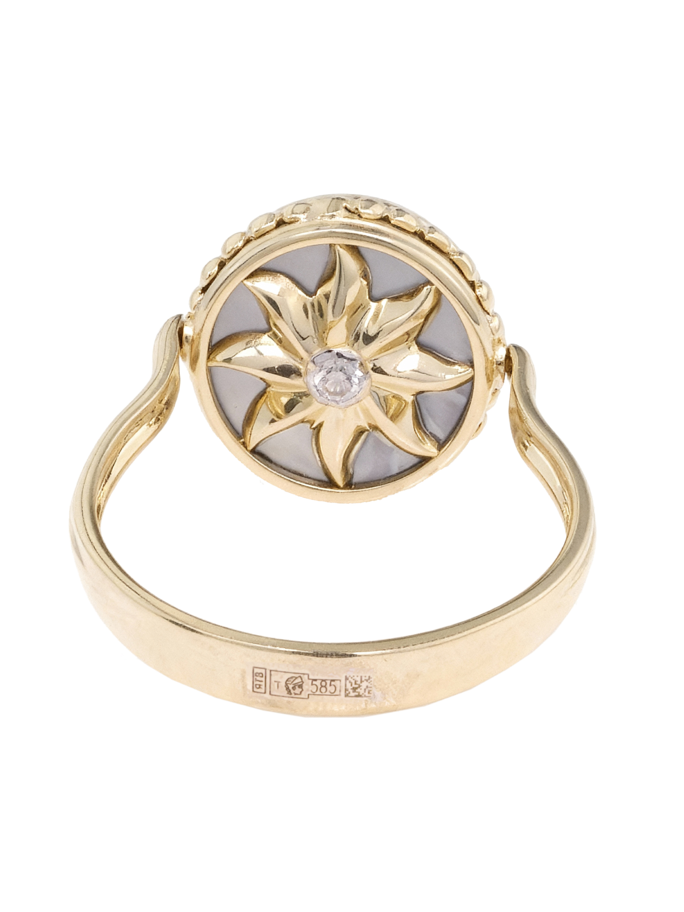 Кольцо из лимонного золота c бриллиантами, ониксом и перламутром