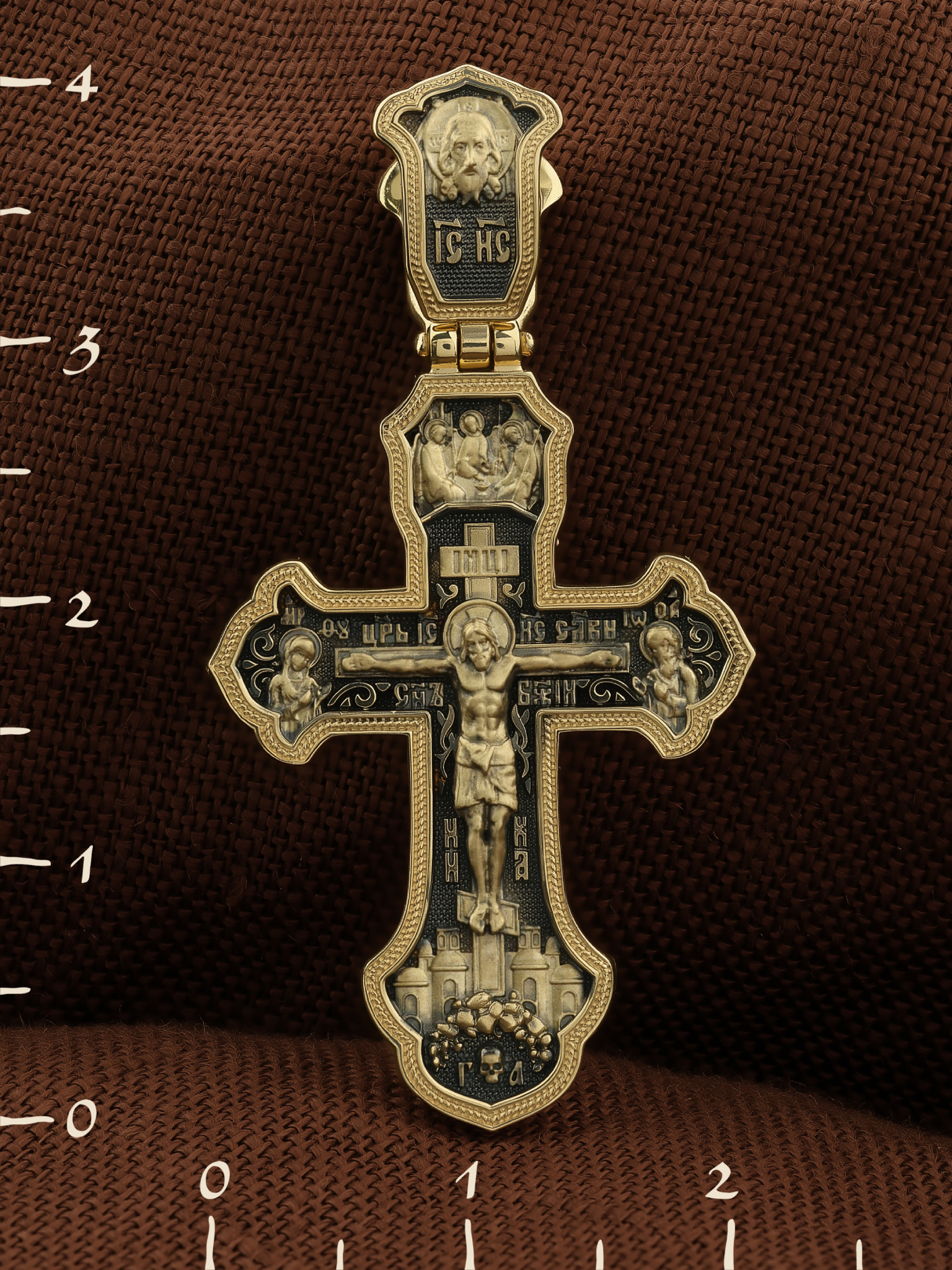 На лицевой стороне креста изображено Распятие Господа и Спасителя нашего Иисуса Христа, отдавшего Себя на смерть, для искупления грехов мира. Крест является символом жертвенной любви Всеблагого Бога к падшим людям, всепобеждающим духовным оружием христиан, основанием и средоточием церковной жизни. Господь сказал: кто хочет идти за Мною, отвергнись себя, и возьми крест свой, и следуй за Мною. (Мк. 8: 34). Над распятием помещена икона Святой Троицы, написанная преподобным Андреем Рублёвым в XV веке. На иконе изображены три ангела, являющихся образом Единосущного и Триипостасного Бога — Святой Троицы. На кулонном кольце изображен Нерукотворный образ Господа и Спасителя нашего Иисуса Христа. На верхней табличке, выше головы Иисуса, расположена надпись, составленная Понтием Пилатом — «IНЦI». Она означает «Иисус Назорей, Царь Иудейский». Надпись «IC» «ХC», означает Иисус Христос, помещается на разных сторонах поперечной перекладины креста. Рядом — слово «НИКА», что означает «победитель» и надпись «Царь Славы». Слева от Распятия изображена Пресвятая Богородица, справа — Про-рок Предтеча и Креститель Господень Иоанн. Ниже расположена надпись «Сын Божий». За крестом высится Иерусалимская стена, в знак того, что Господь был распят вне стен города. Крест стоит на горе камней, символизирующих Голгофу. В ее основании различается череп– это голова Адама.