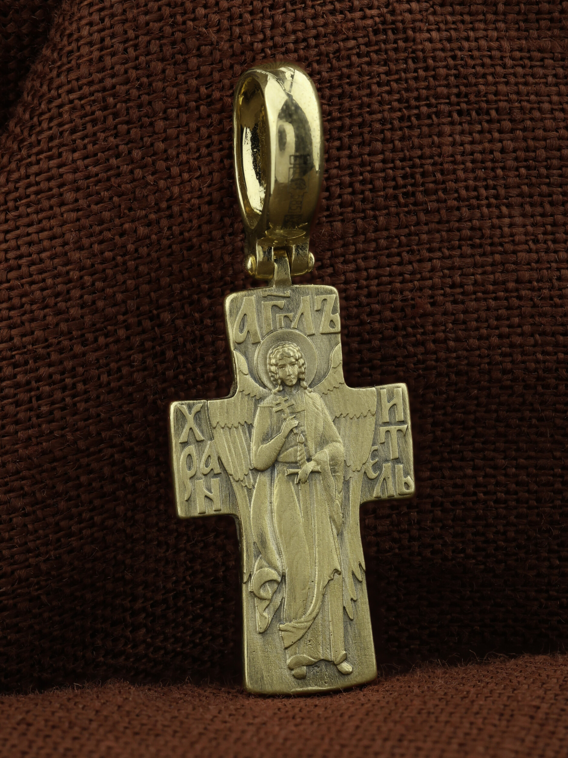 На оборотной стороне креста изображен Святой Ангел-Хранитель. Это Ангел приставляемый Богом к человеку при крещении для охраны и помощи в добрых делах. Он невидимо находится при человеке на протяжении всей его жизни, если человек сохраняет в себе любовь к Богу и истинную веру перед Ним. Ангел-Xранитель делают для нас все, что служит к истинному нашему благу и спасению. Невидимо пребывая при нас постоянно, он наставляет нас на все доброе и полезное, возносит наши молитвы к Богу, охраняют и защищают нас от врагов видимых и невидимых, ходатайствует за нас пред Богом.