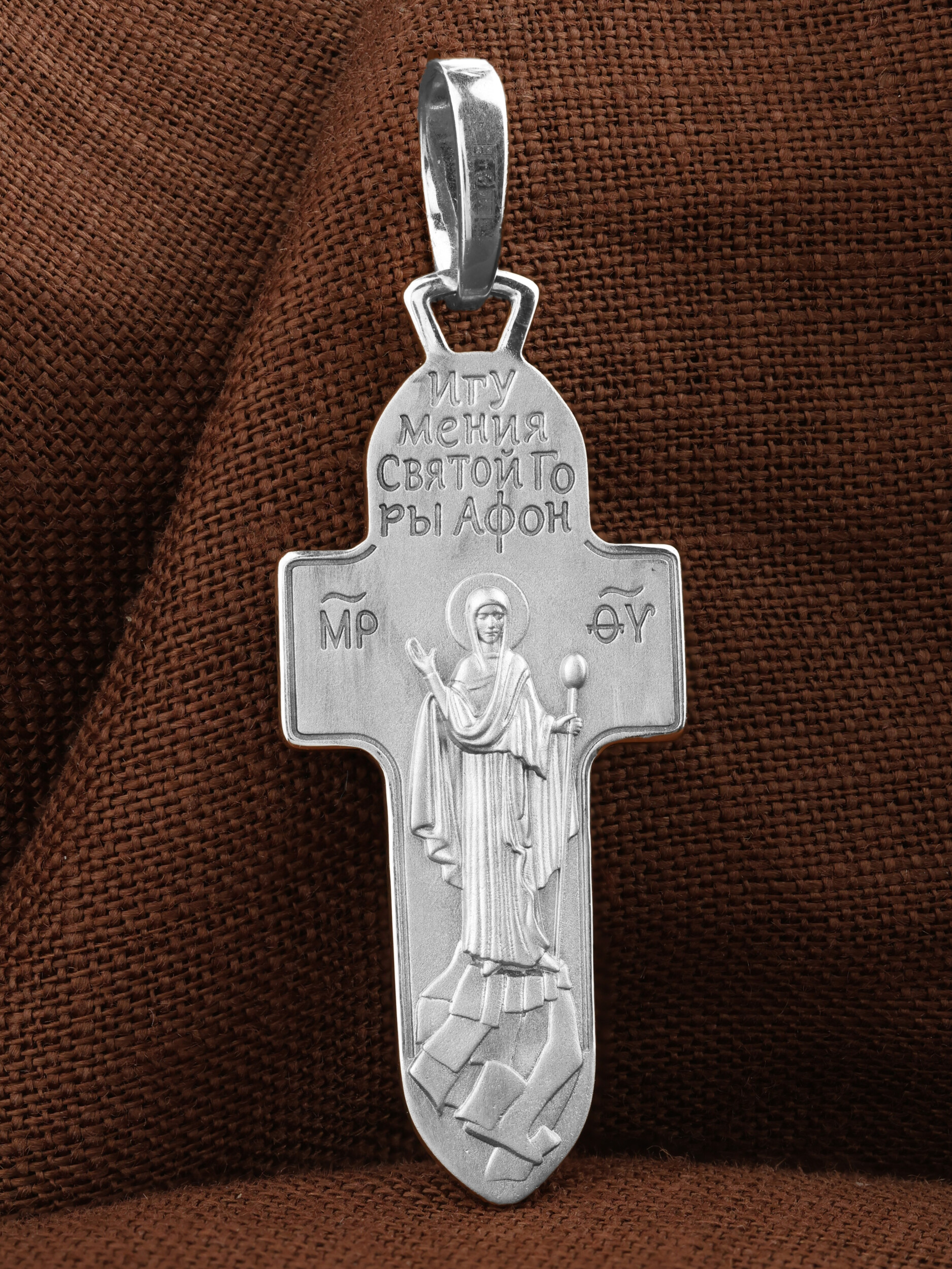 На оборотной стороне креста изображена Икона Божией Матери «Игумения Святой Горы Афонской». Икона написана греческим иконописцем афонского монастыря схимонахом Паисием. Богоматерь изображена с игуменским жезлом над всем монашеским островом. Святое предание связывает появление монашеских обителей на Святой Горе с особым попечительством Пресвятой Богородицы на Афоне. Божия Матерь возвестила евангельское учение жителям горы Афон, которые были язычниками. Народ слушал Ее проповеди, затем уверовал и крестился. Силой Своей проповеди и многочисленными чудесами Богородица обратила местных жителей в христианство. Она поставила там начальником и учителем одного из Апостольский мужей и сказала: «Сие место буди мне и жребий, данный мне от Сына Бога моего».