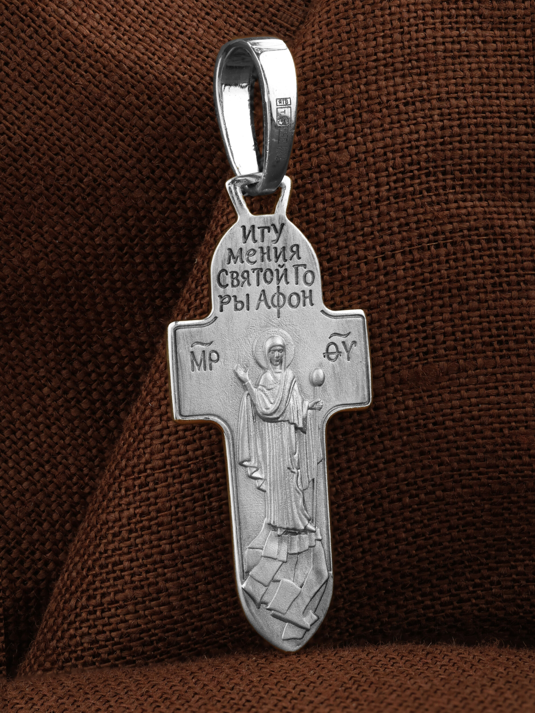 На оборотной стороне креста изображена Икона Божией Матери «Игумения Святой Горы Афонской». Икона написана греческим иконописцем афонского монастыря схимонахом Паисием. Богоматерь изображена с игуменским жезлом над всем монашеским островом. Святое предание связывает появление монашеских обителей на Святой Горе с особым попечительством Пресвятой Богородицы на Афоне. Божия Матерь возвестила евангельское учение жителям горы Афон, которые были язычниками. Народ слушал Ее проповеди, затем уверовал и крестился. Силой Своей проповеди и многочисленными чудесами Богородица обратила местных жителей в христианство. Она поставила там начальником и учителем одного из Апостольский мужей и сказала: «Сие место буди мне и жребий, данный мне от Сына Бога моего».