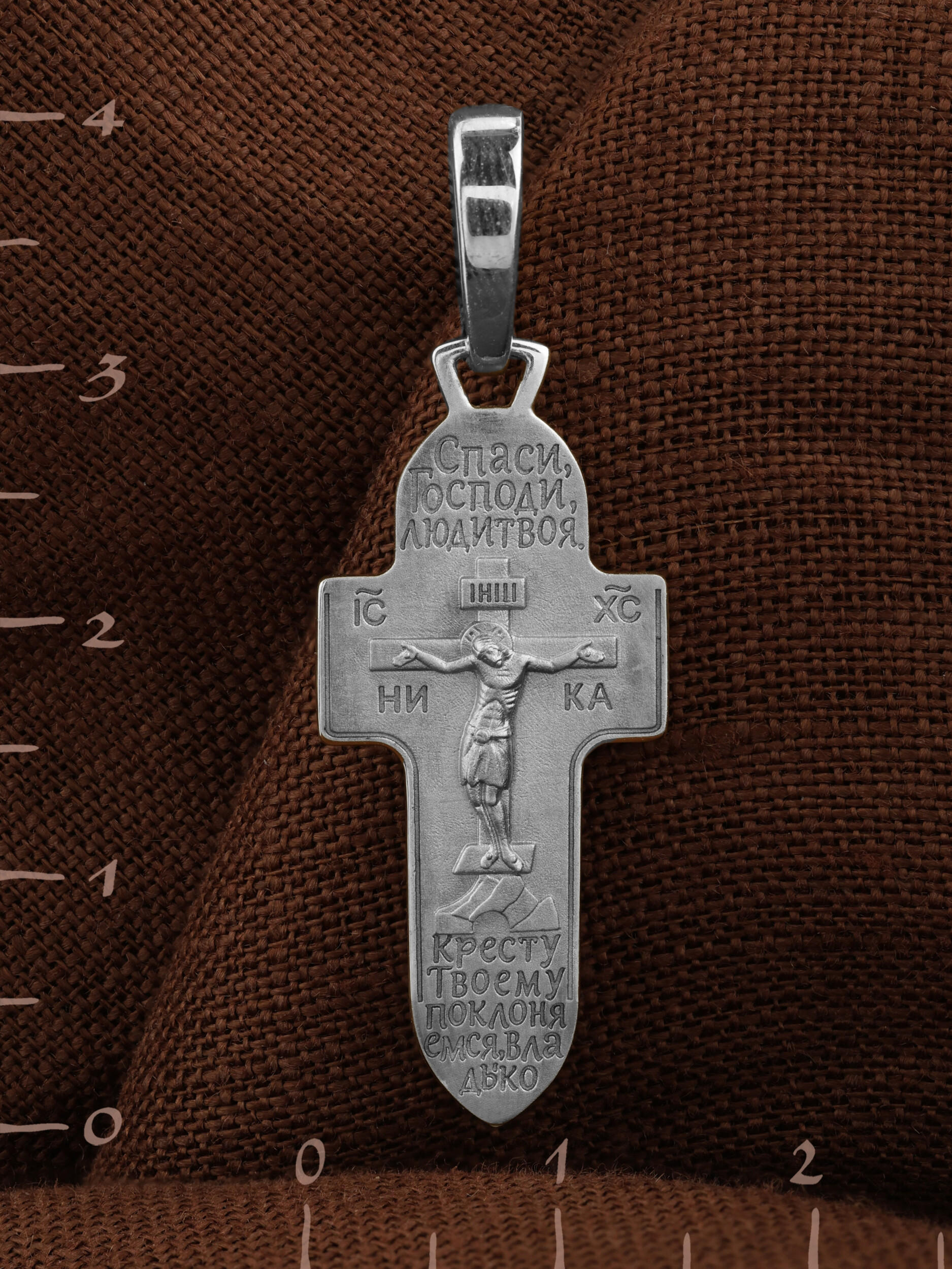 На лицевой стороне креста изображено Распятие Господа и Спасителя нашего Иисуса Христа. Крест- символ спасения и искупления рода человеческого, знамение победы над смертью и адом. Иисус Христос, как искупительная жертва освобождения человечества от власти греха, умер крестной смертью и в третий день воскрес. На верхней табличке, выше головы Иисуса, расположена надпись, составленная Понтием Пилатом — «IНЦI». Она означает «Иисус Назорей, Царь Иудейский». Надпись «IC» «ХC», означает Иисус Христос, помещается на разных сторонах поперечной перекладины креста. Под ней помещено слово «НIКА», что означает Победитель. Крест стоит на горе камней, символизирующих Голгофу.