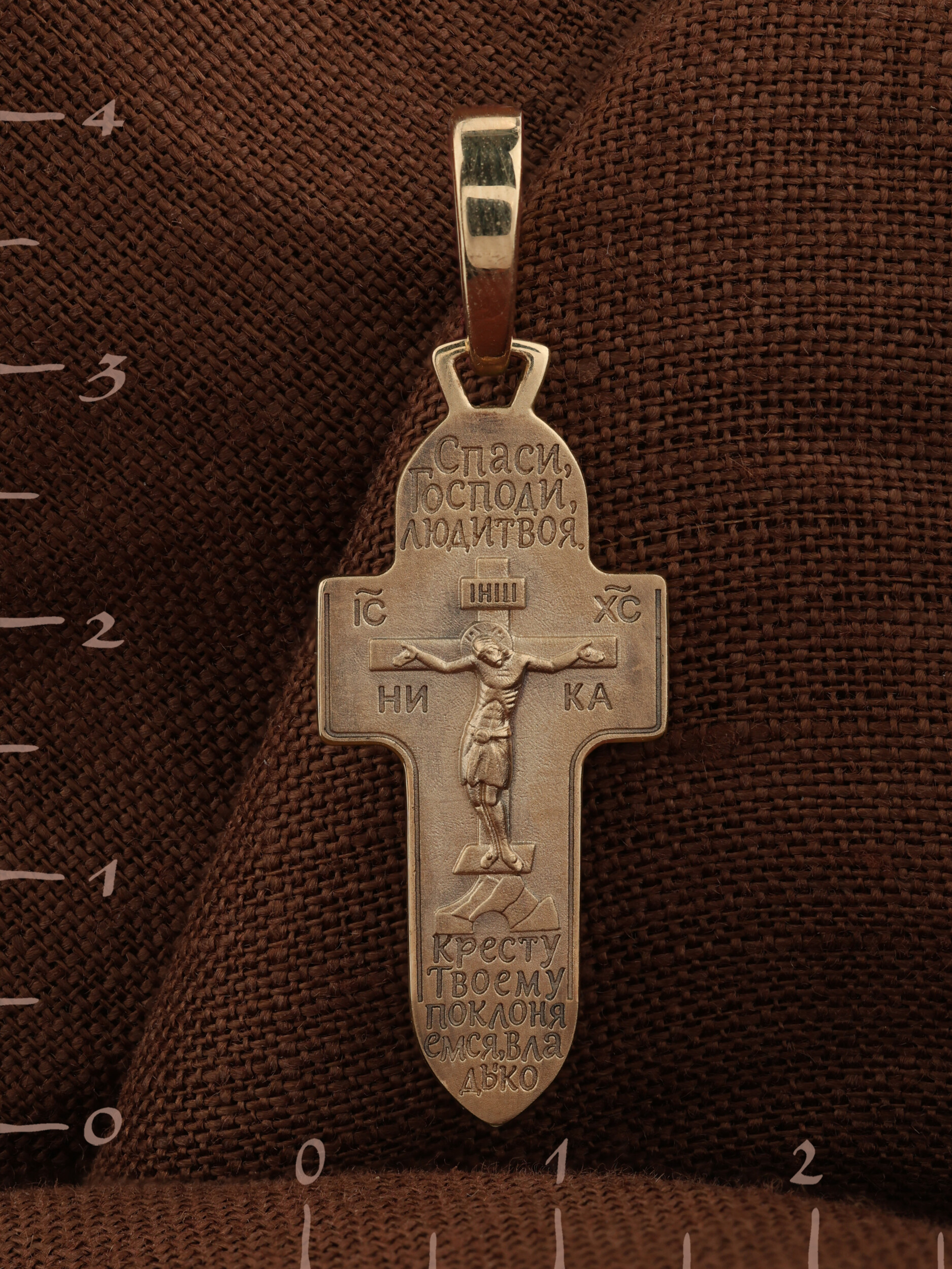 На лицевой стороне креста изображено Распятие Господа и Спасителя нашего Иисуса Христа. Крест- символ спасения и искупления рода человеческого, знамение победы над смертью и адом. Иисус Христос, как искупительная жертва освобождения человечества от власти греха, умер крестной смертью и в третий день воскрес. На верхней табличке, выше головы Иисуса, расположена надпись, составленная Понтием Пилатом — «IНЦI». Она означает «Иисус Назорей, Царь Иудейский». Надпись «IC» «ХC», означает Иисус Христос, помещается на разных сторонах поперечной перекладины креста. Под ней помещено слово «НIКА», что означает Победитель. Крест стоит на горе камней, символизирующих Голгофу.
