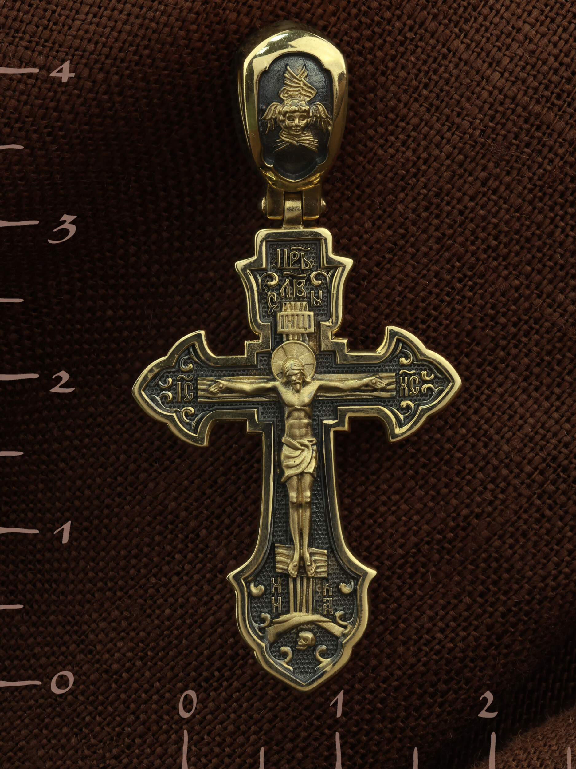 На лицевой стороне этого креста центральную часть занимает икона Распятия Христа — образ жертвы, принесенной Господом за грехи людей. Над титлом видим слова «ЦРЬ СЛВЫ» — Царь Славы. Верхняя перекладина символизирует собой табличку с надписью «IHЦI» — Иисус Назарянин Царь Иудейский. Возле перекладины пишется сокращенно имя Спасителя «IC XC» — Иисус Христос. У подножия мы видим четыре буквы «МЛ» «РБ» — Место Лобное Рай Бысть. Возвышение, на котором стоит Крест, символизирует гору Голгофу, на которой произошло Распятие. У подножия Креста изображают прах Адама, обозначенный черепом. На кулонном кольце изображен шестикрылый Серафим — самый приближенный к Господу Ангел.